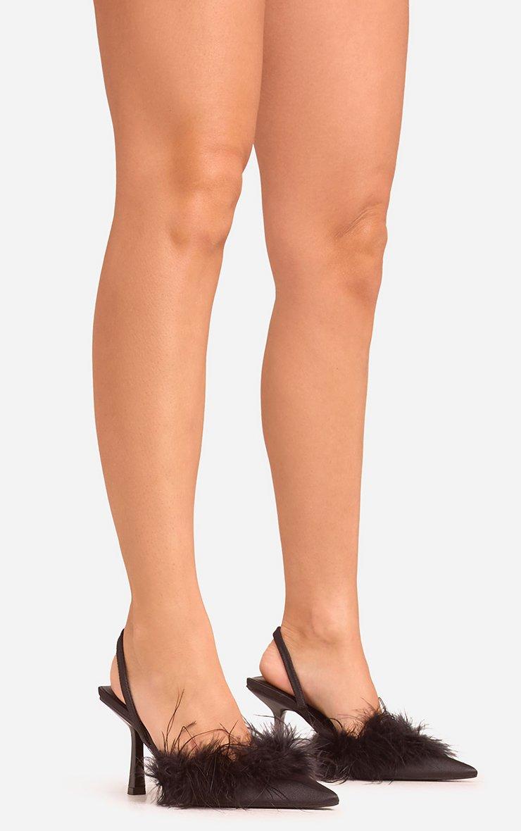 Neo Faux Fluffy Detail Pointed Toe Slingback Court Heel In Black Satin