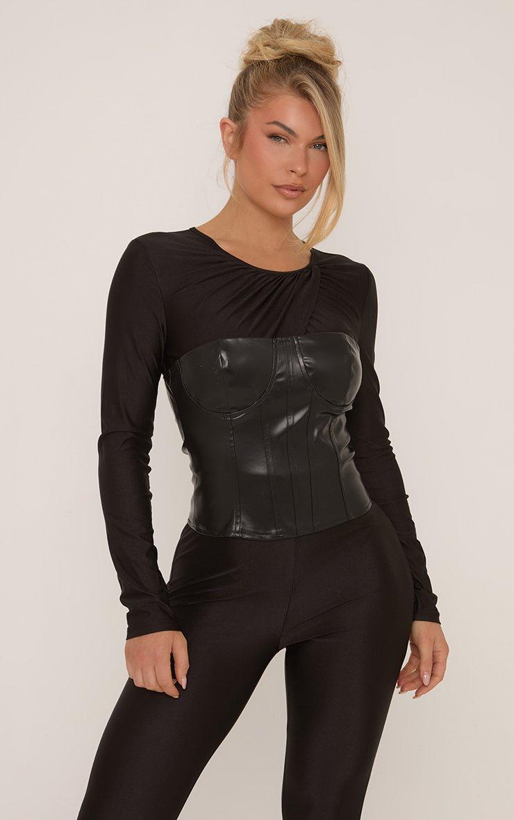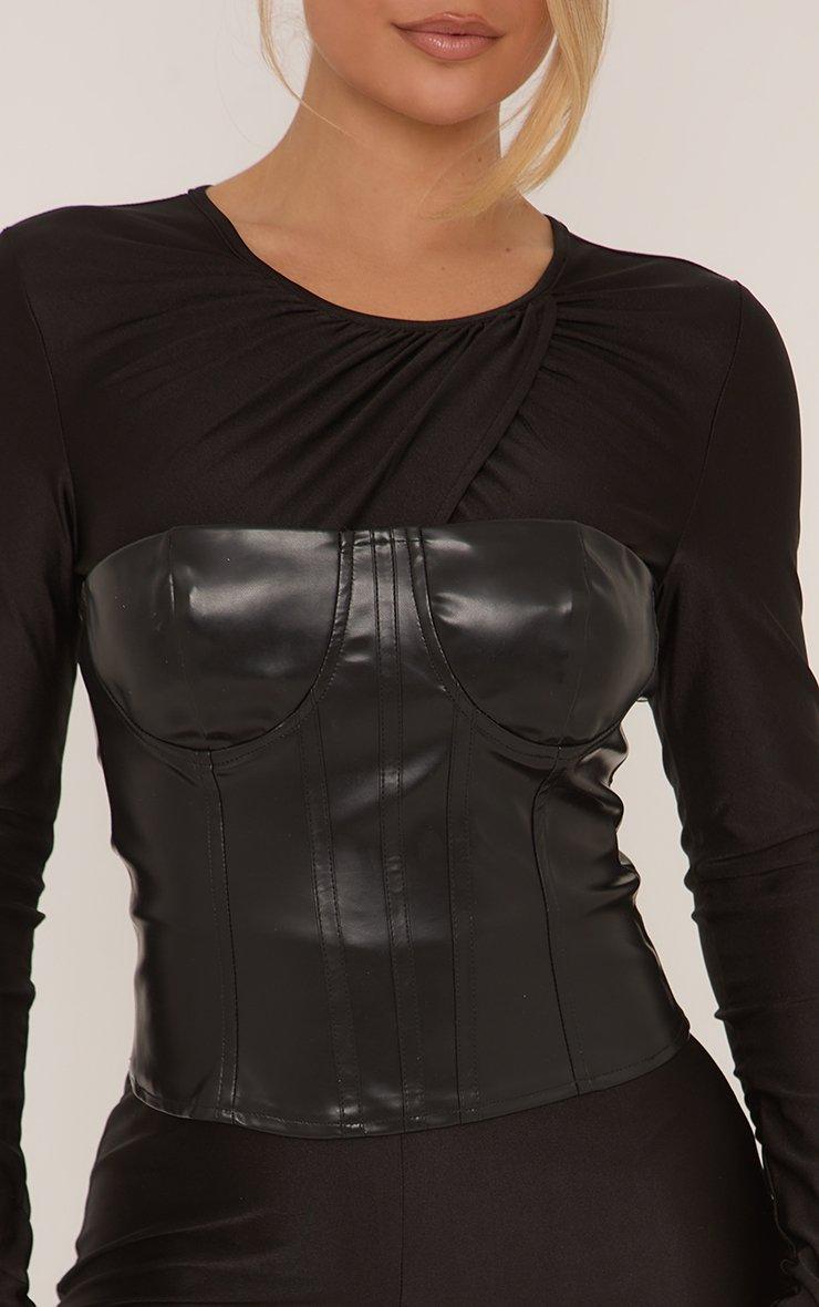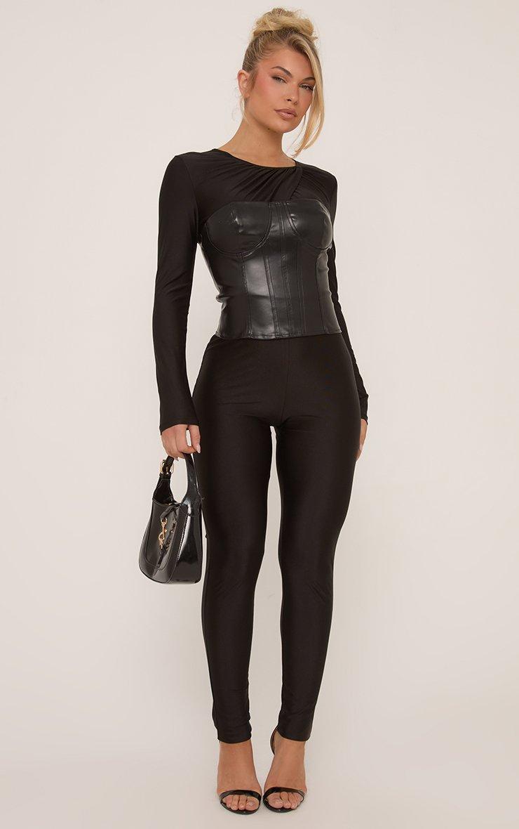 Long Sleeve Twist Detail Faux Leather Corset Overlay Jumpsuit In Black
