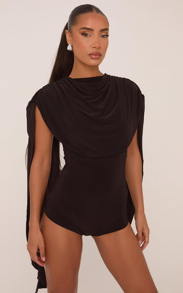 Cap Sleeve Drape Cape Detail Micro Playsuit In Chocolate Black Slinky