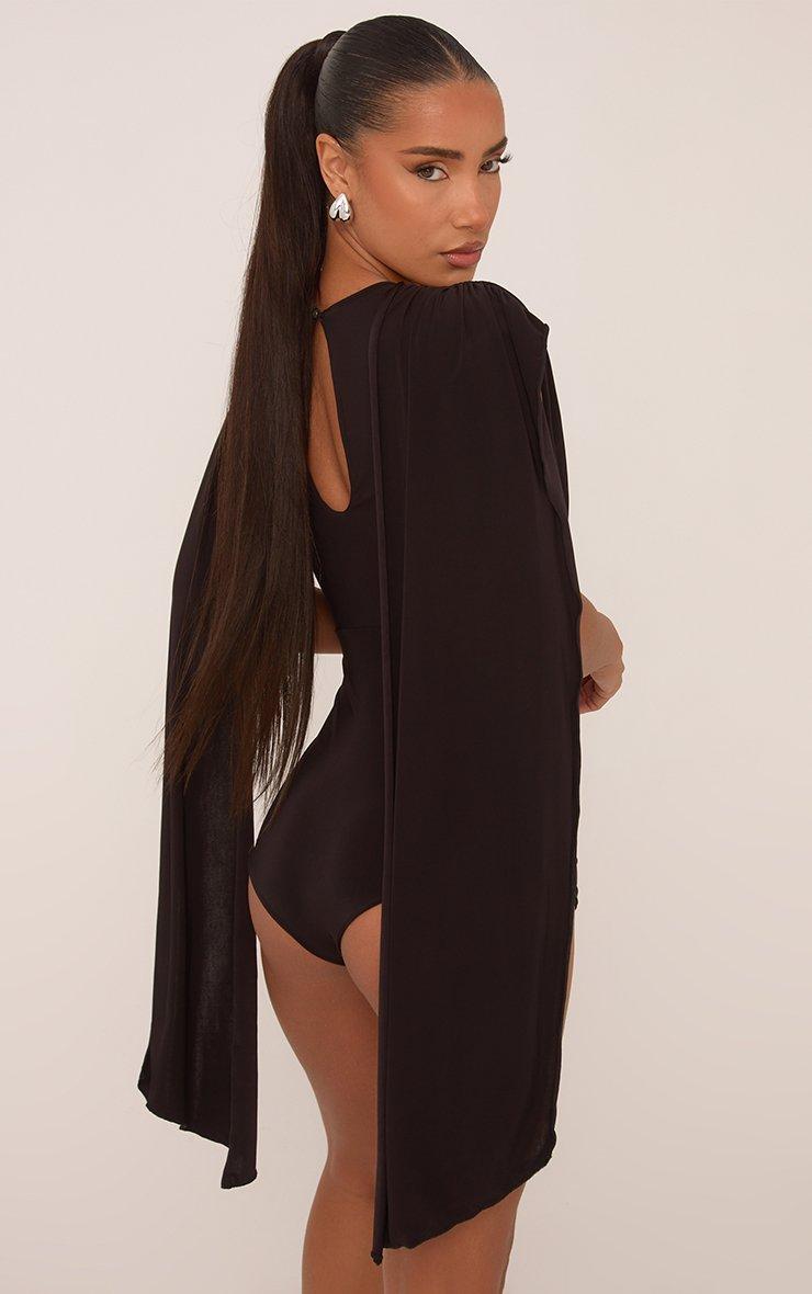 Ready to make a statement, doll? Featuring a chocolate black slinky material with cap sleeves and a dramatic drape cape detail, this micro playsuit is pure elegance with an edge.