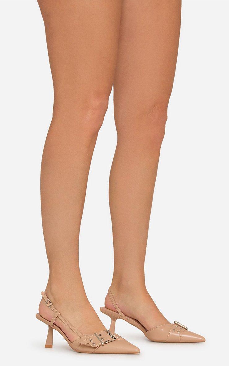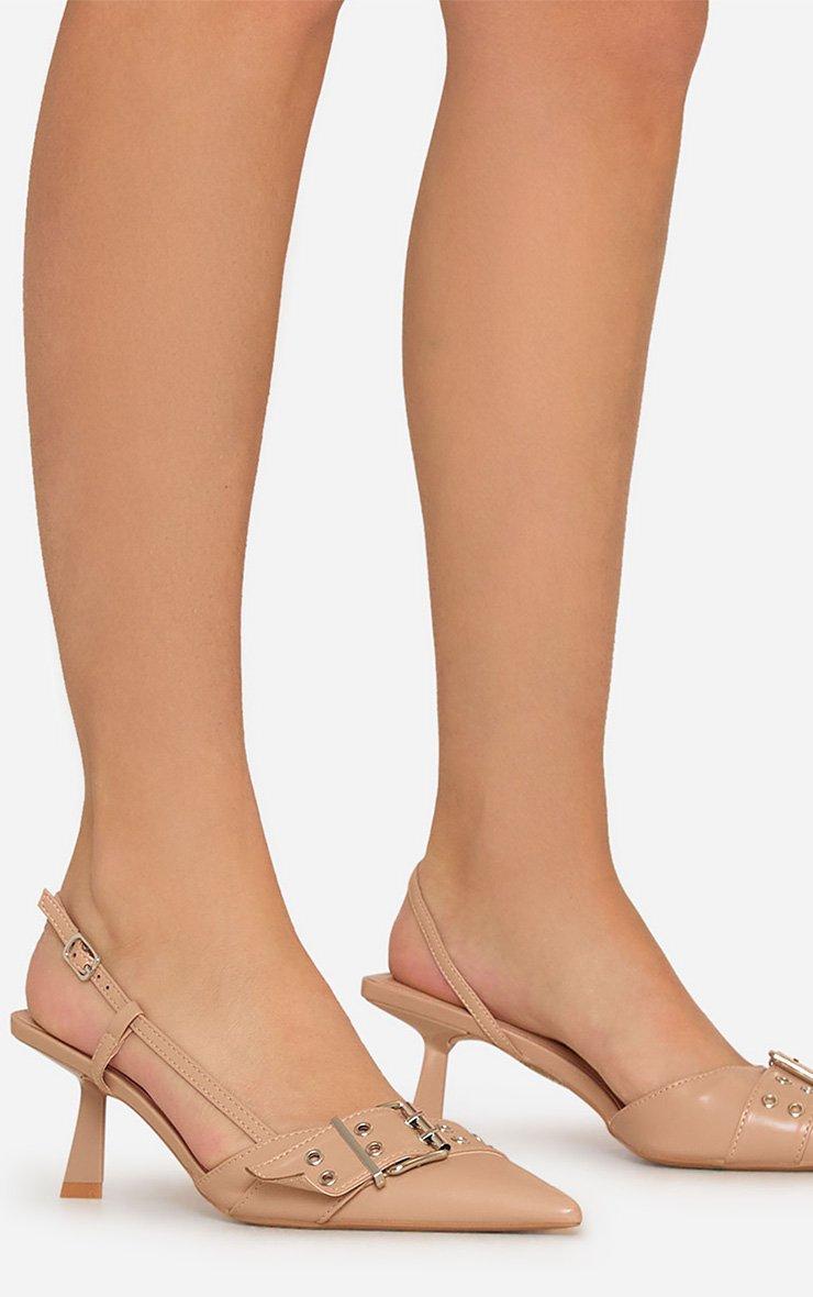 Trish Buckle Detail Pointed Toe Slingback Court Heel In Beige Faux Leather