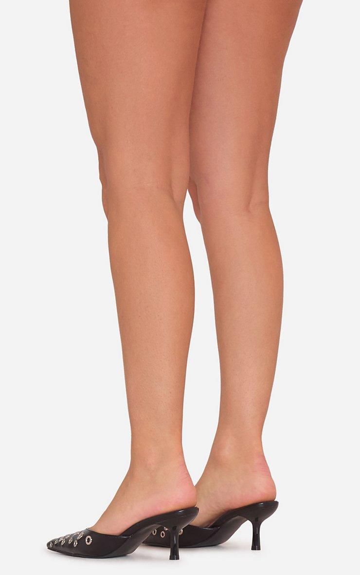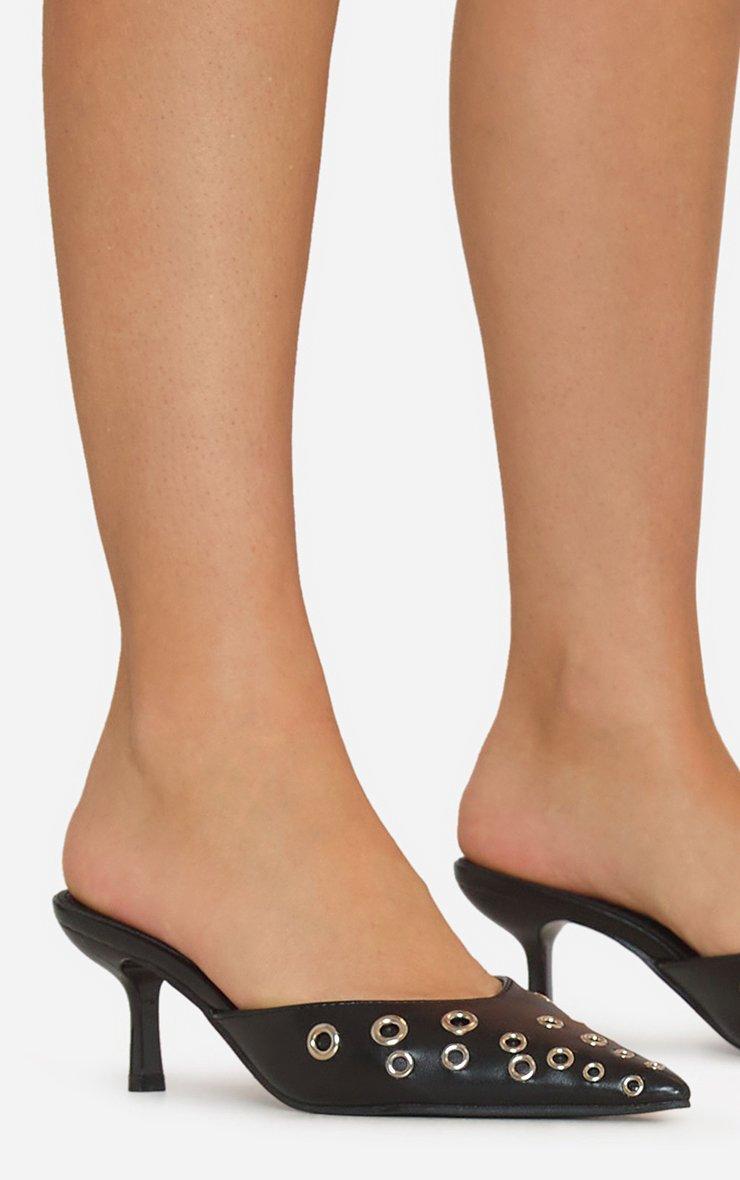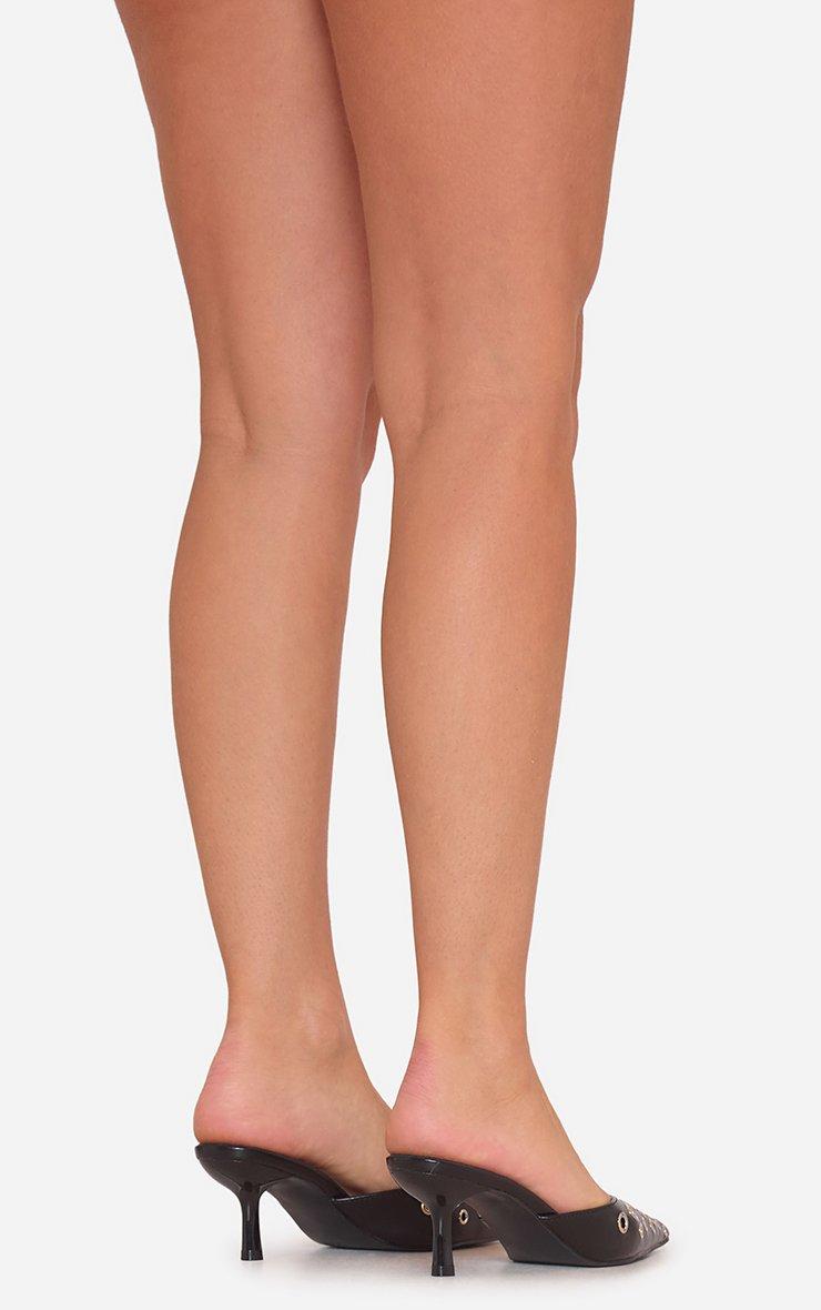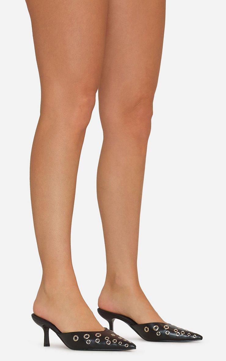 Emilie Eyelet Detail Pointed Toe Heel Mule In Black Faux Leather