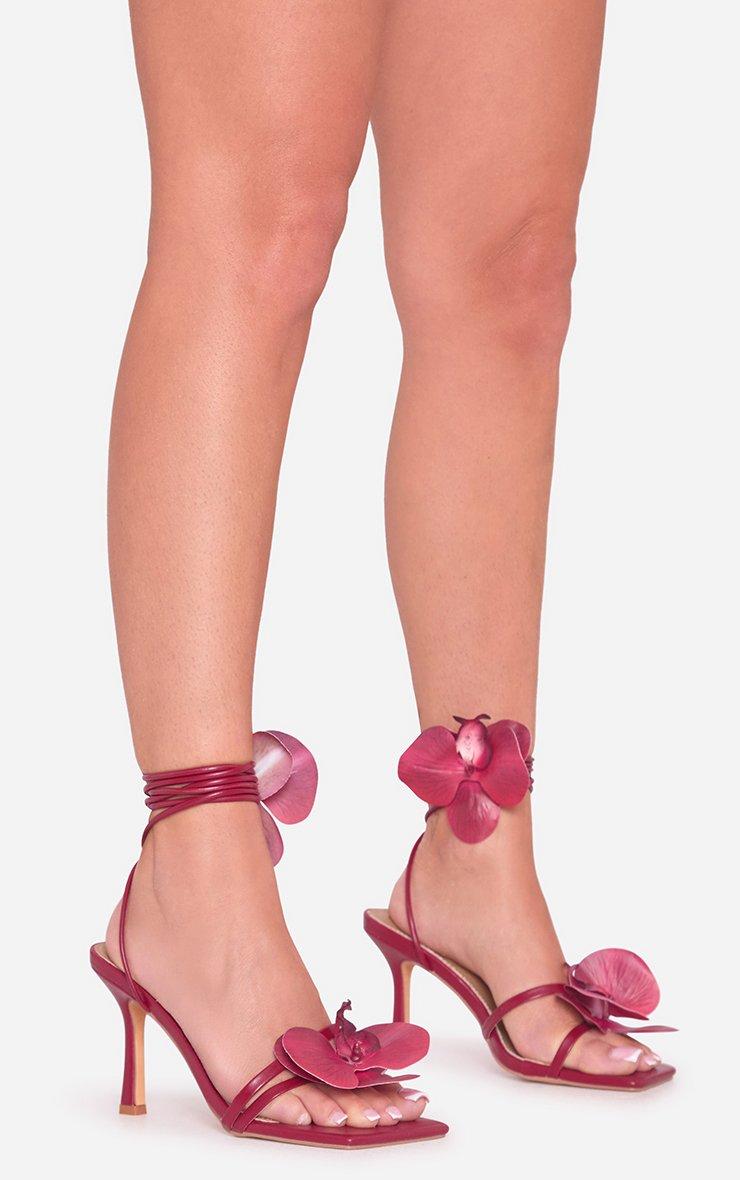 Bring the romance, doll. Featuring burgundy faux leather with lace-up straps, flower detailing, and a square toe, these heels are perfect for adding drama and elegance to your out-out look.