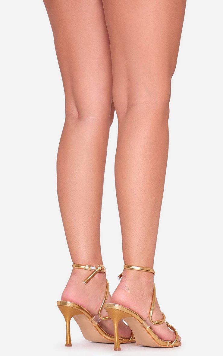 For luxe nights or standout events, doll. Featuring gold faux leather with cross buckle and ankle strap detailing, these heels bring all the sparkle and sophistication, with a touch of fierce elegance.