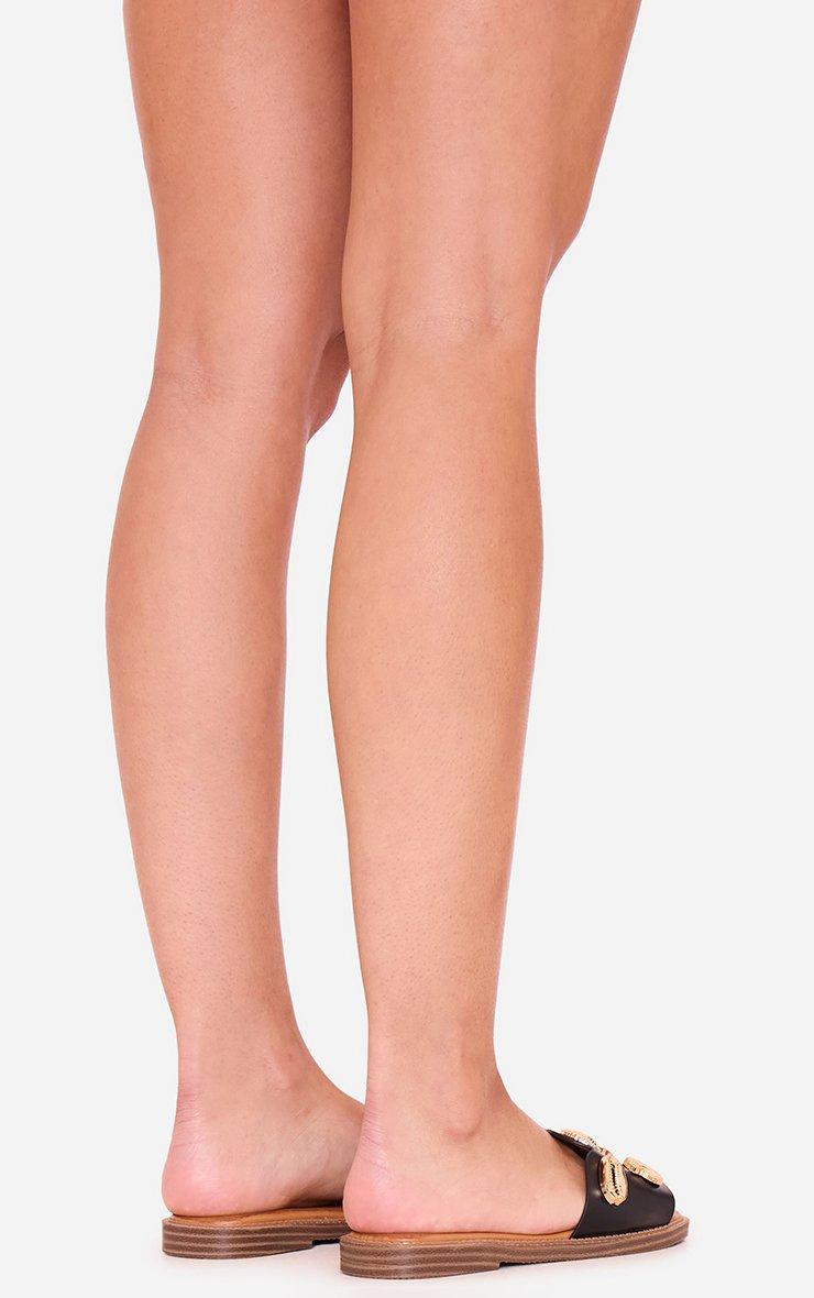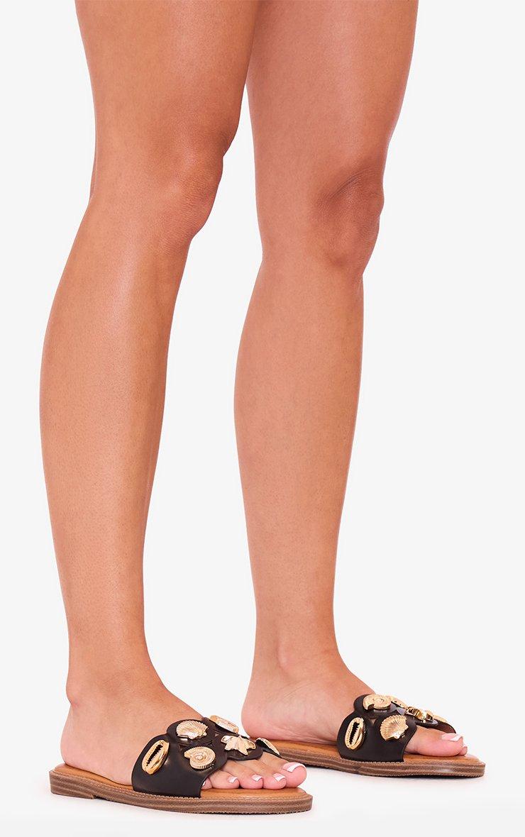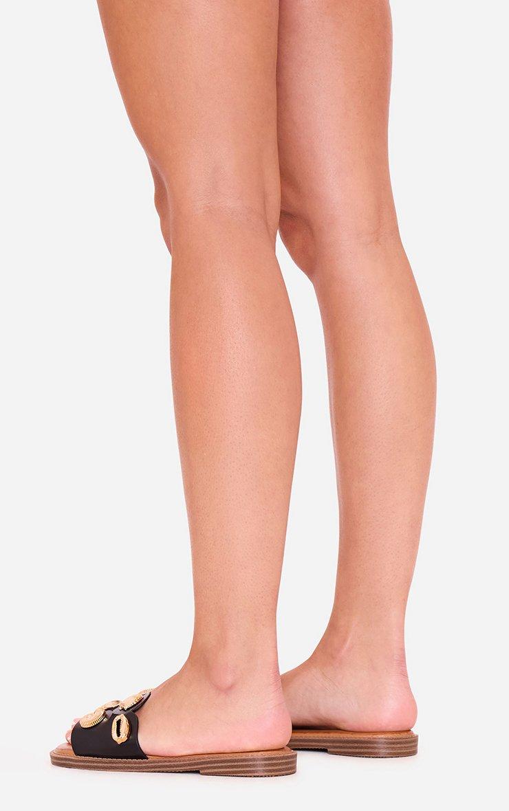 Serve sleek vibes, doll! Featuring black faux leather with shell detail and flat slider styling, these sandals bring bold, chic energy perfect for stepping out with attitude.