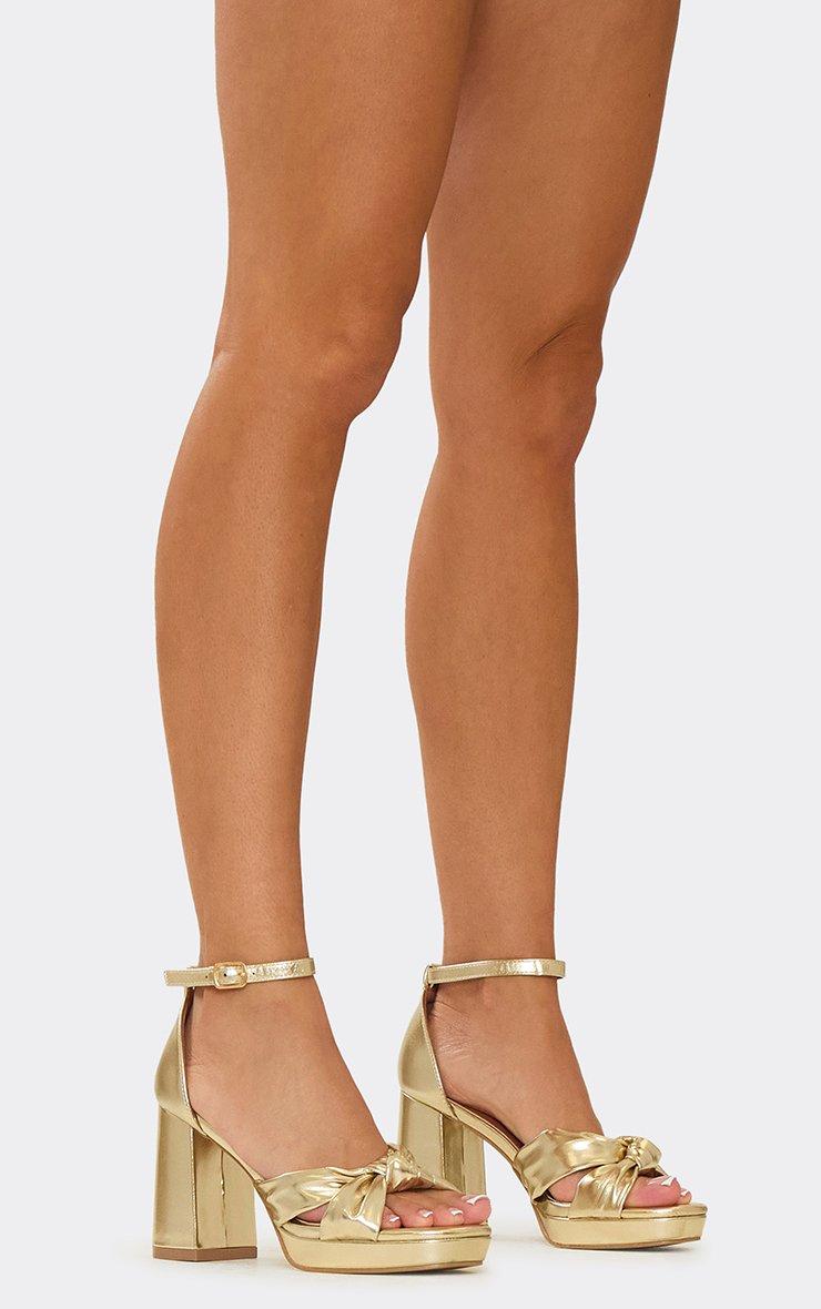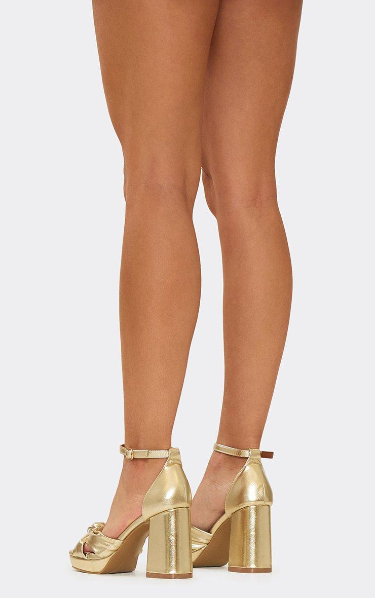 Mahdi Ankle Strap Knotted Detail Platform Block Heel In Gold Faux Leather