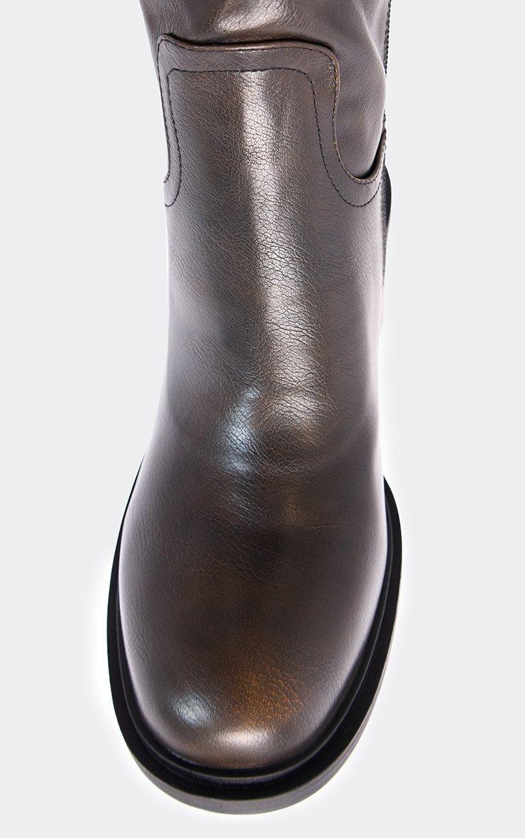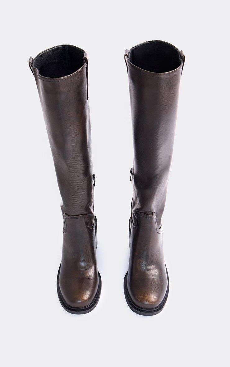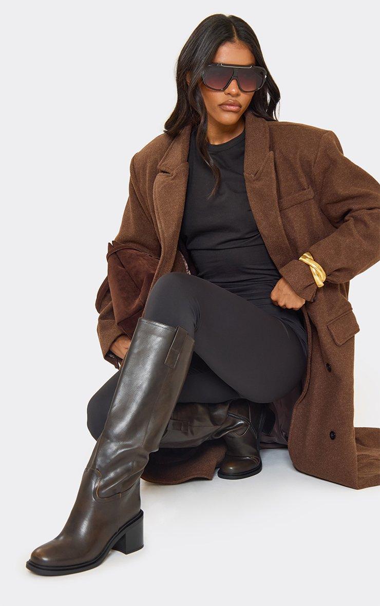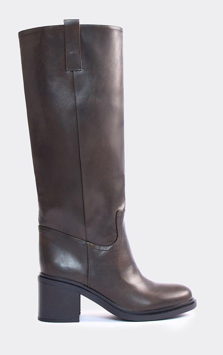 Tough Block Heel Knee High Boot In Brown Faux Leather