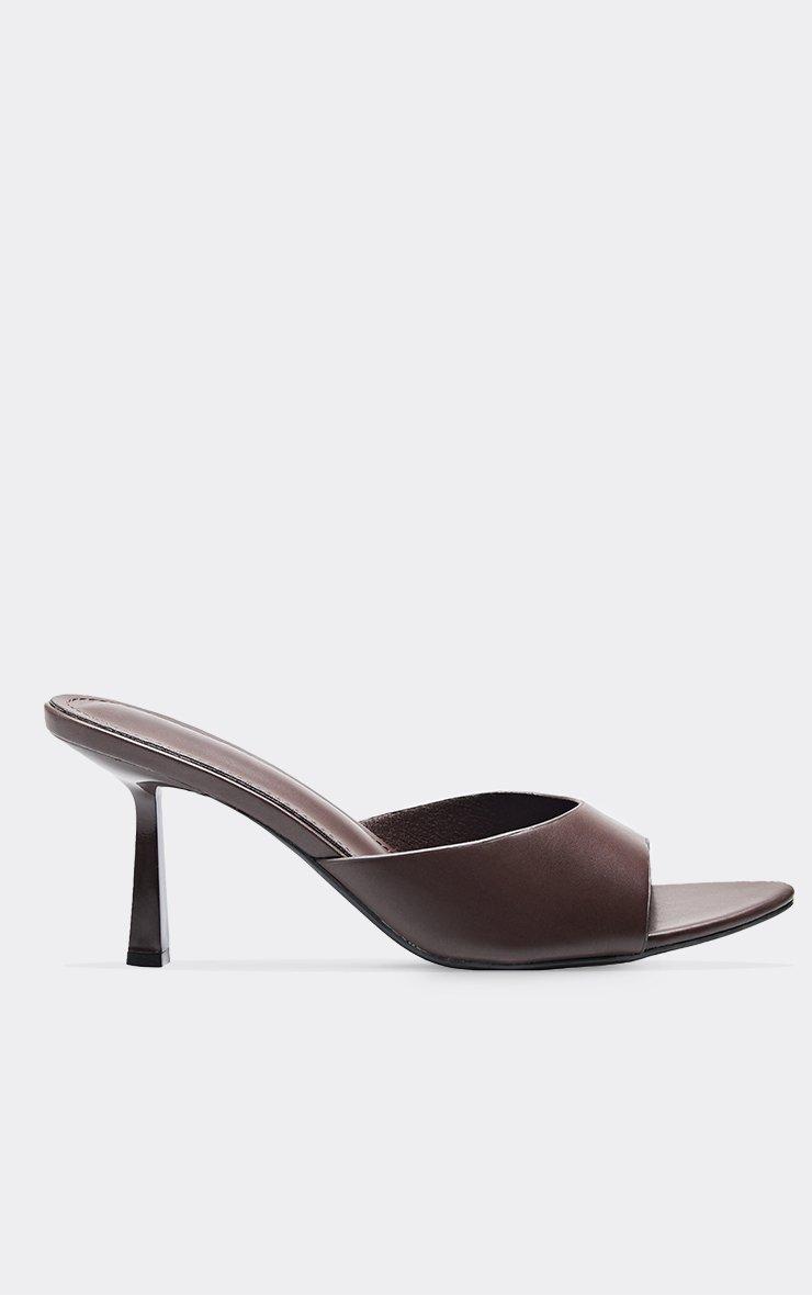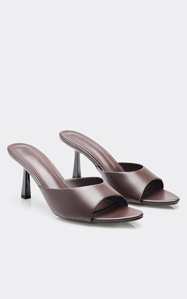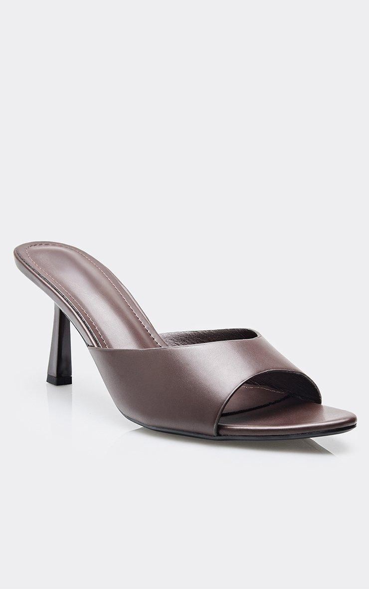 Elevate your autumn rotation for your next city break. Featuring brown faux leather material with peep toe detailing, these chic heeled mules are a total vibe for your new season collection.