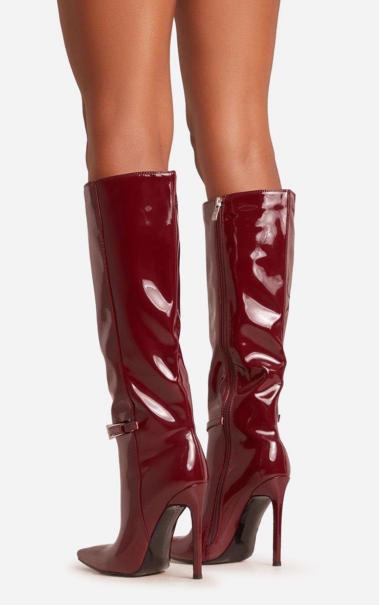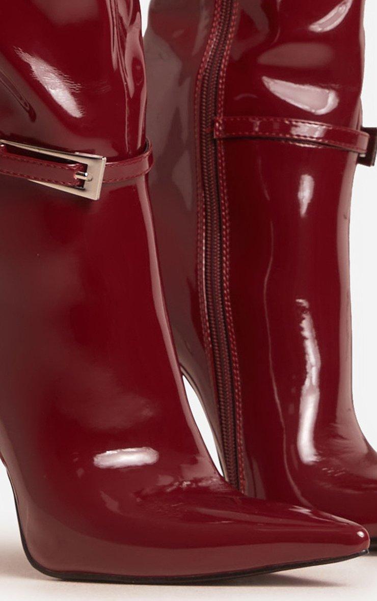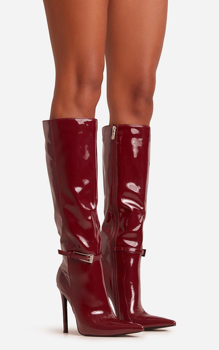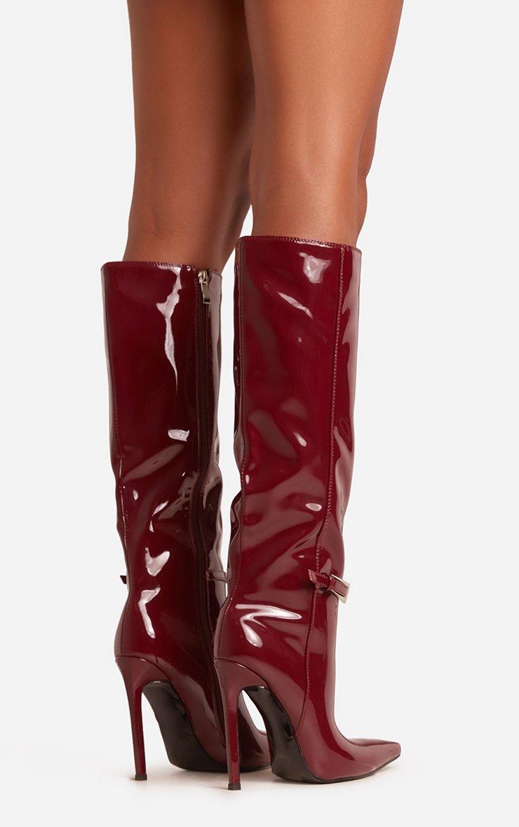 Grace Strap Detail Pointed Toe Stiletto Heel Knee High Long Boot In Burgundy Patent
