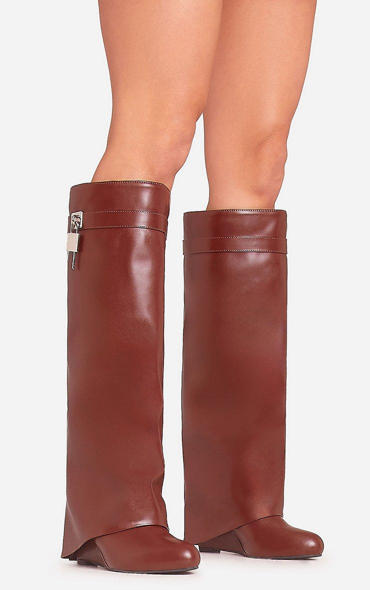 Turn heads in our I Am the One Padlock Detail Wedge Heel Knee High Long Boot In Brown Faux Leather. These brown knee high boots with wedge heel are all about making a bold statement. The rich brown faux leather adds seasonal tones, while the eye-catching padlock detail brings an edgy twist. You'll strut your stuff with confidence in these unreal knee-high boots!