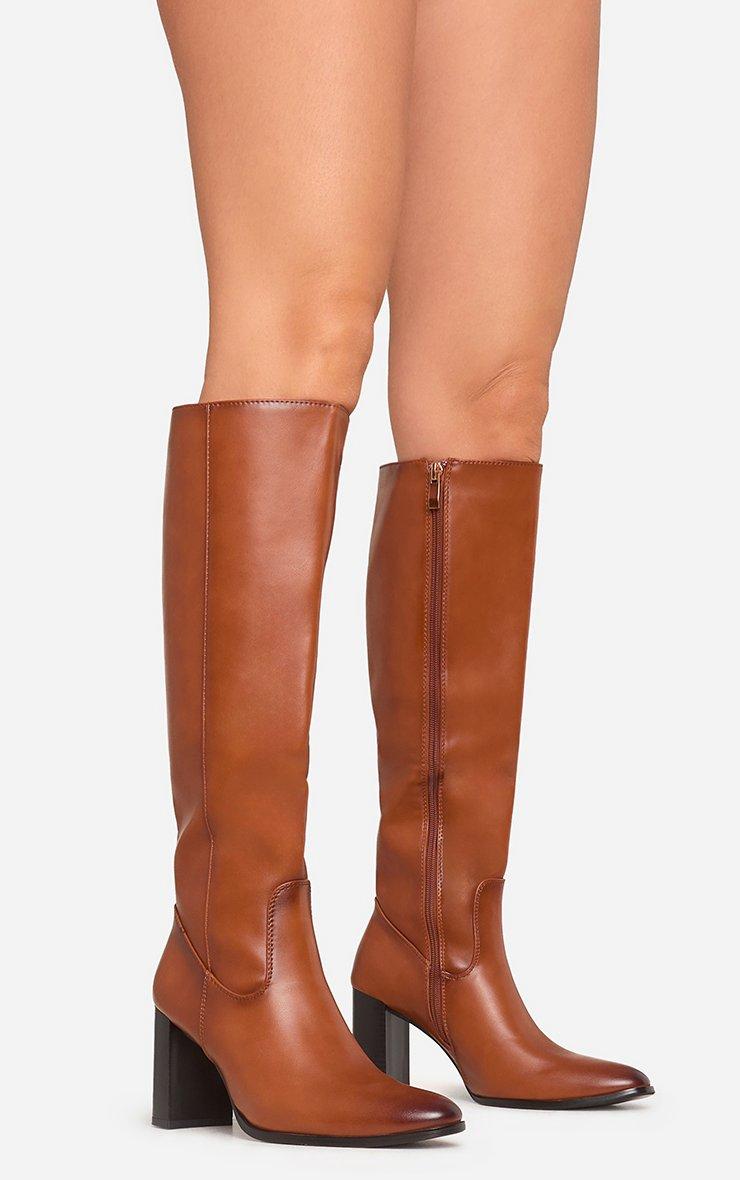 Xoe Square Toe Thin Block Heel Knee High Long Boot In Tan Brown Faux Leather