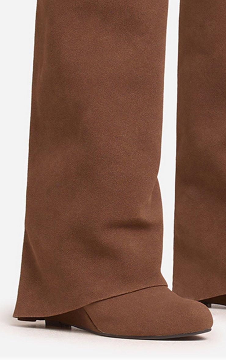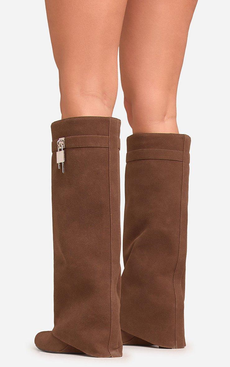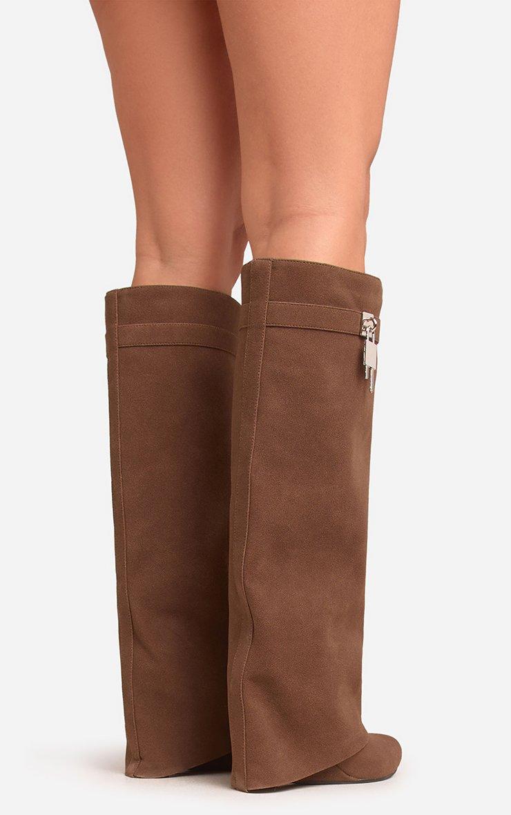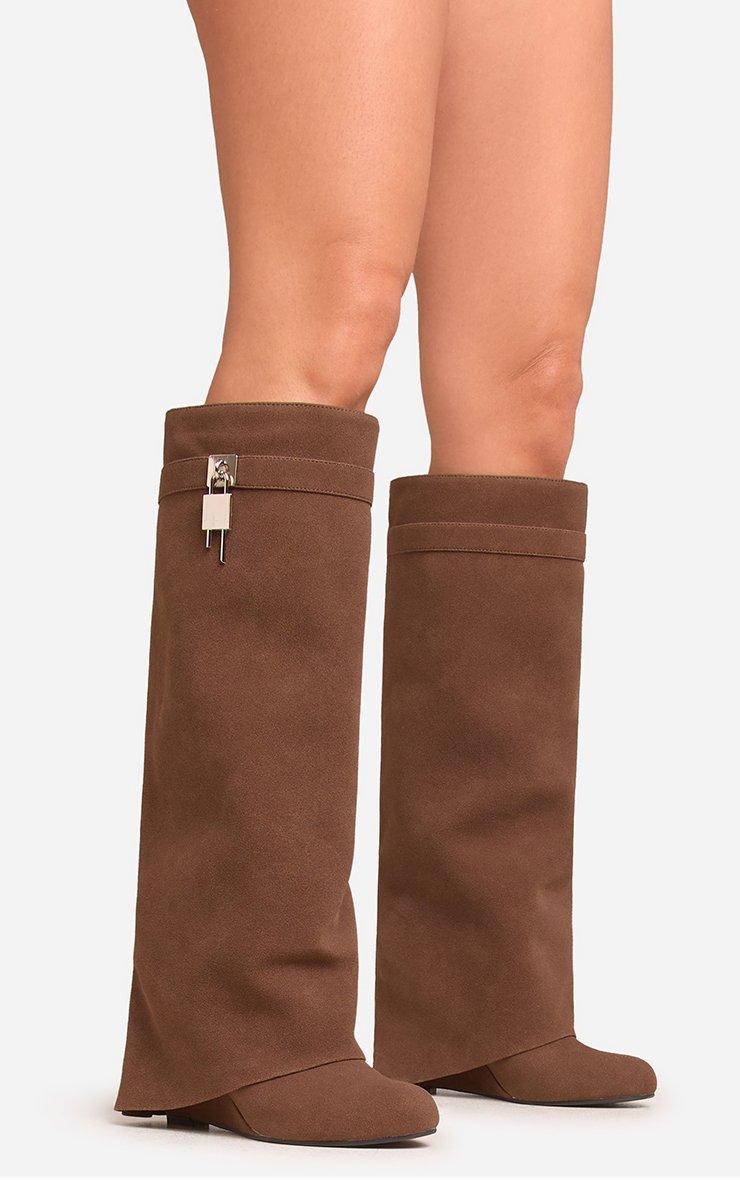 I-Am-The-One Padlock Detail Wedge Heel Knee High Long Boot In Brown Faux Suede