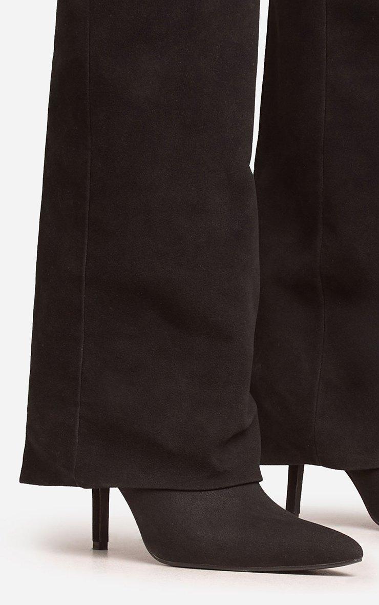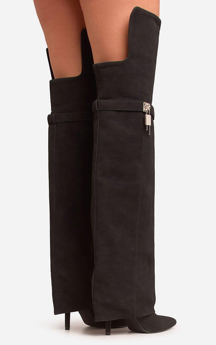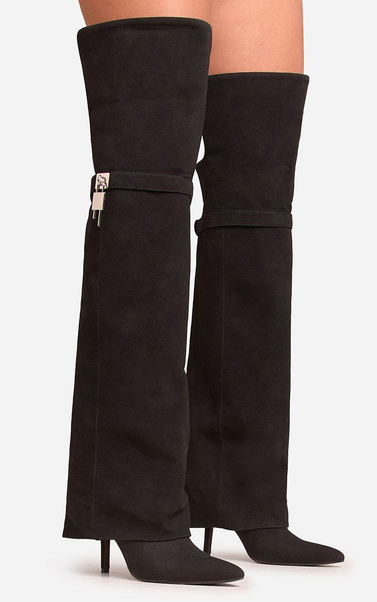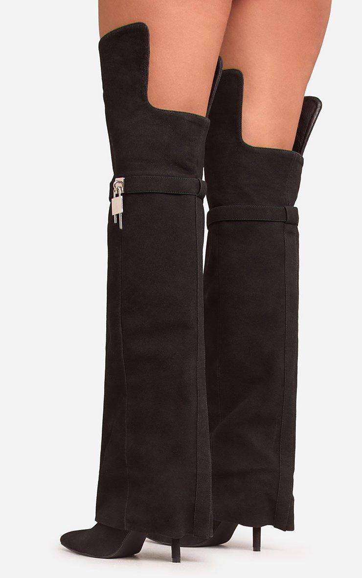 Upgrade your vibe with our High-Standard Padlock Detail Stiletto Heel Over The Knee Thigh High Boot In Black Faux Suede. These black faux suede over the knee boots bring major attitude with their edgy padlock detail and sleek stiletto heel. Get ready to turn heads in these fierce thigh high boots!
