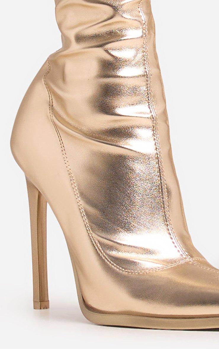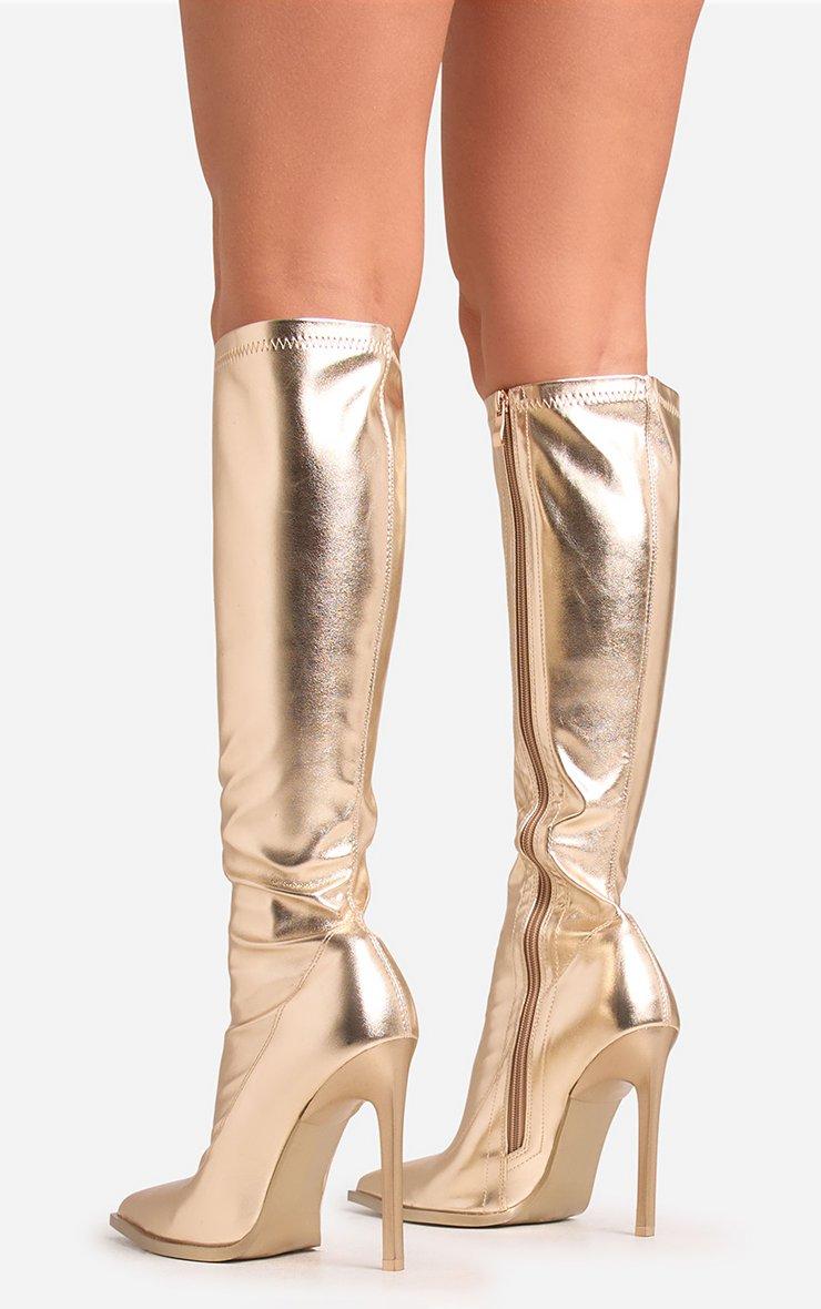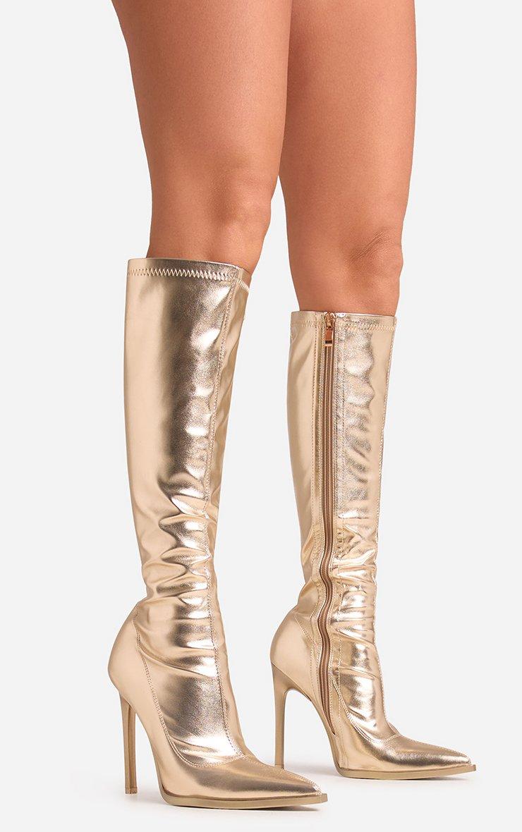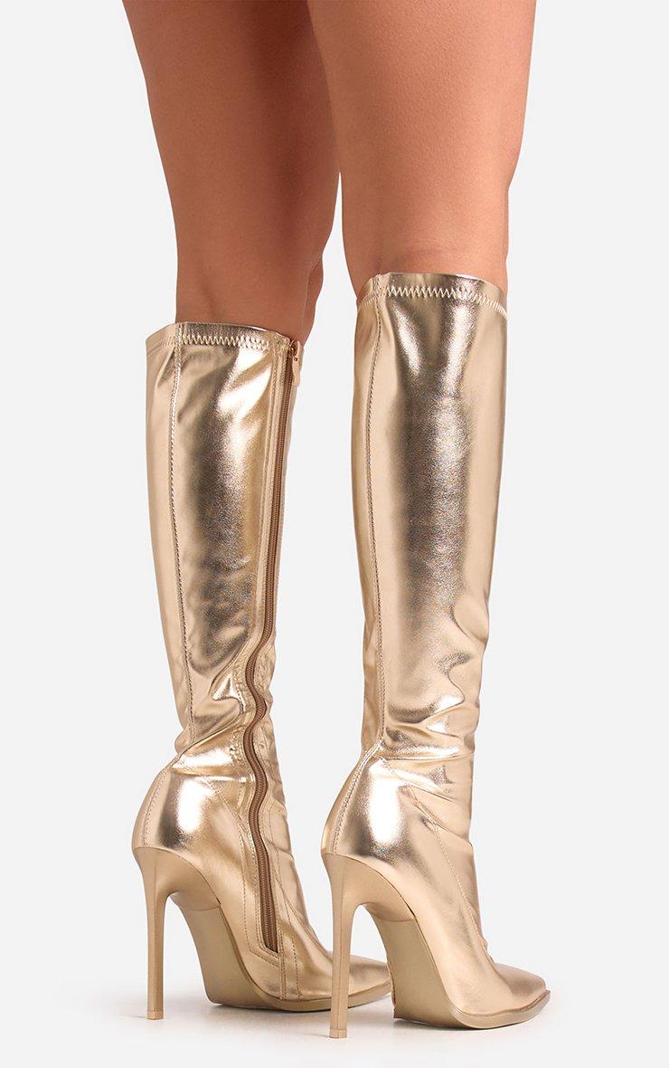 Isbah Pointed Toe Stiletto Heel Knee High Long Boot In Gold Faux Leather