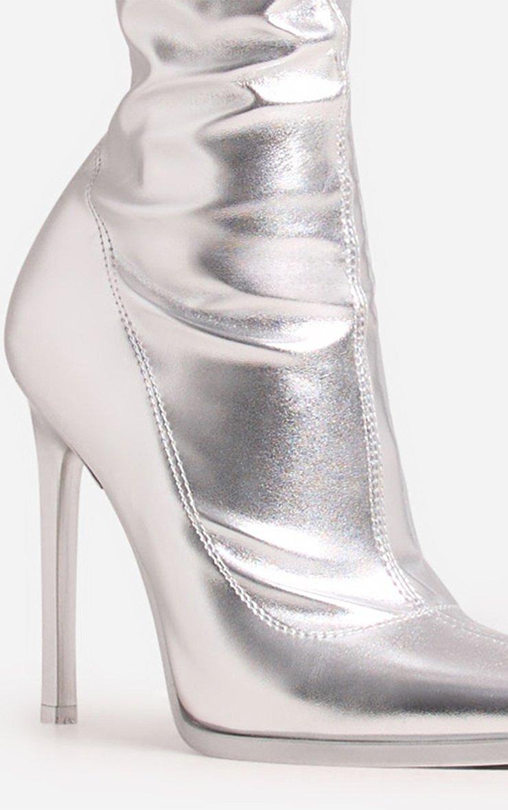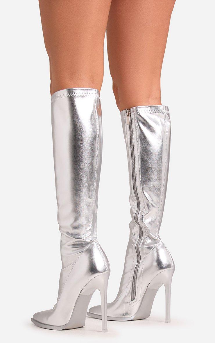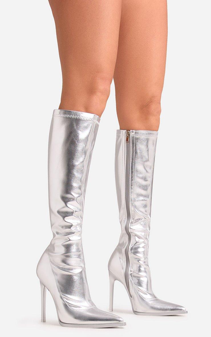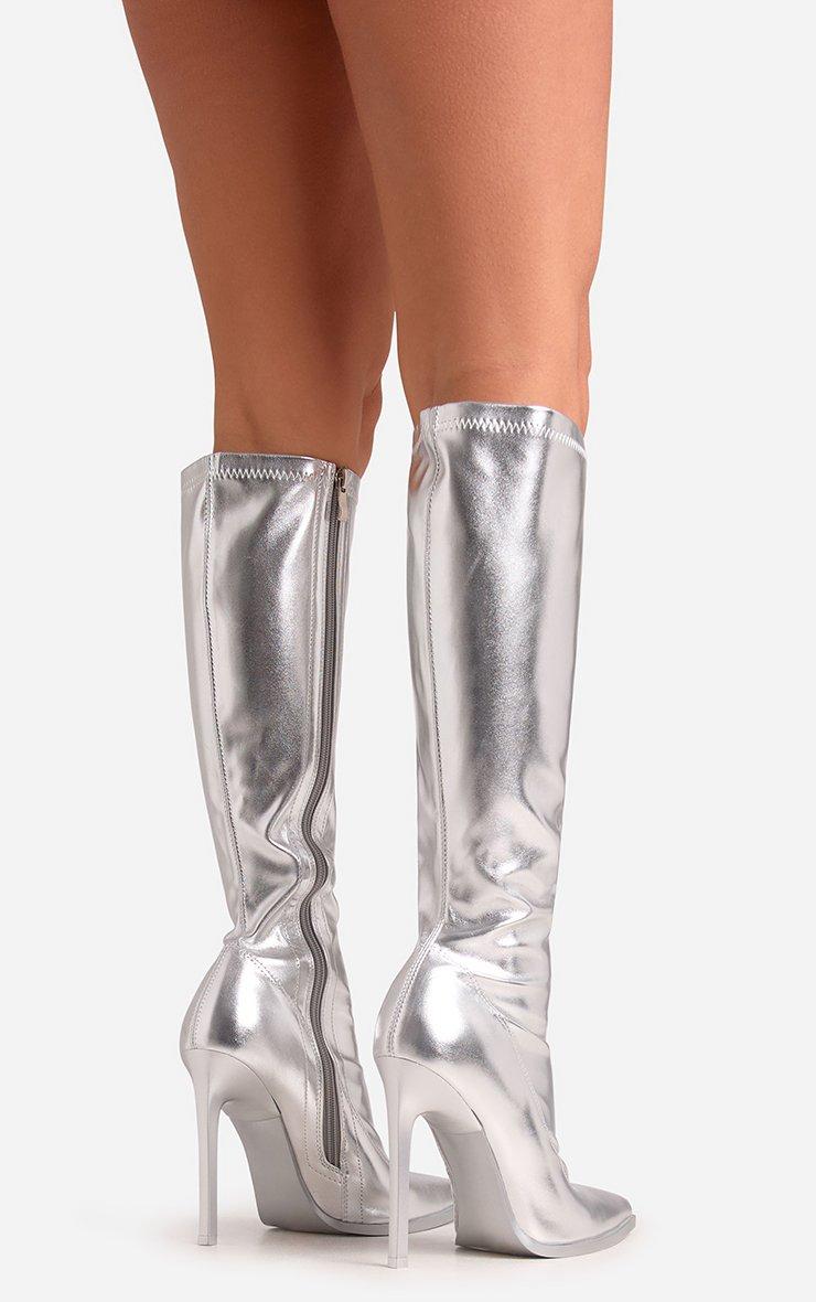 Isbah Pointed Toe Stiletto Heel Knee High Long Boot In Silver Faux Leather