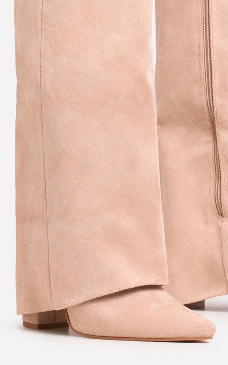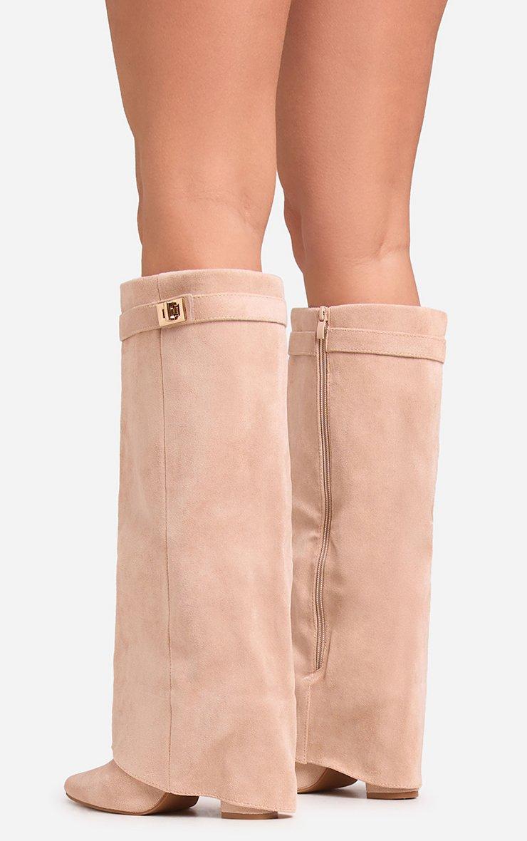 Devin Lock Layered Detail Pointed Toe Block Heel Knee High Long Boot In Nude Faux Suede