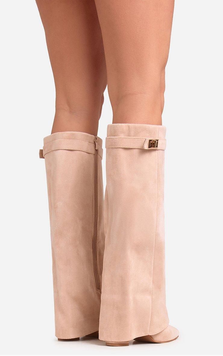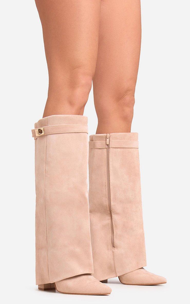 Step up your shoe game with our Devin Lock Layered Detail Pointed Toe Block Heel Knee High Long Boot In Nude Faux Suede. These suede block heel knee high boots bring serious attitude with their edgy lock detail, layered design and sleek pointed toe. Crafted in nude faux suede, these knee high boots are your new season crush!