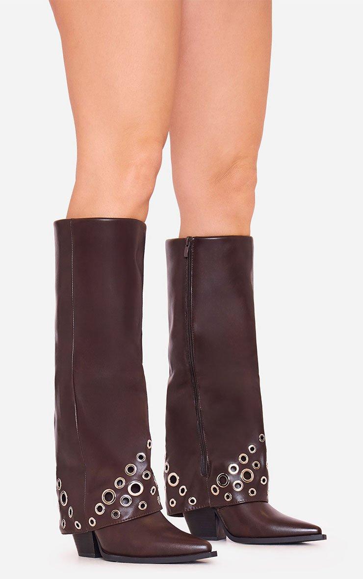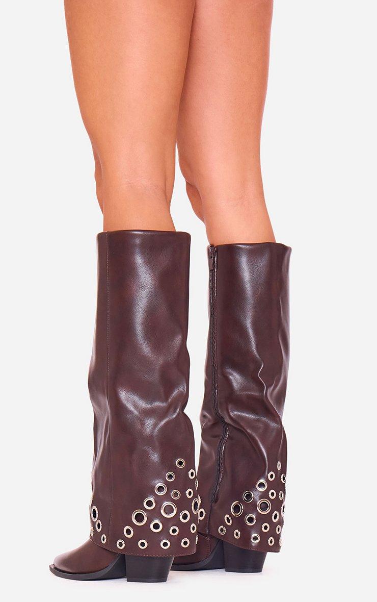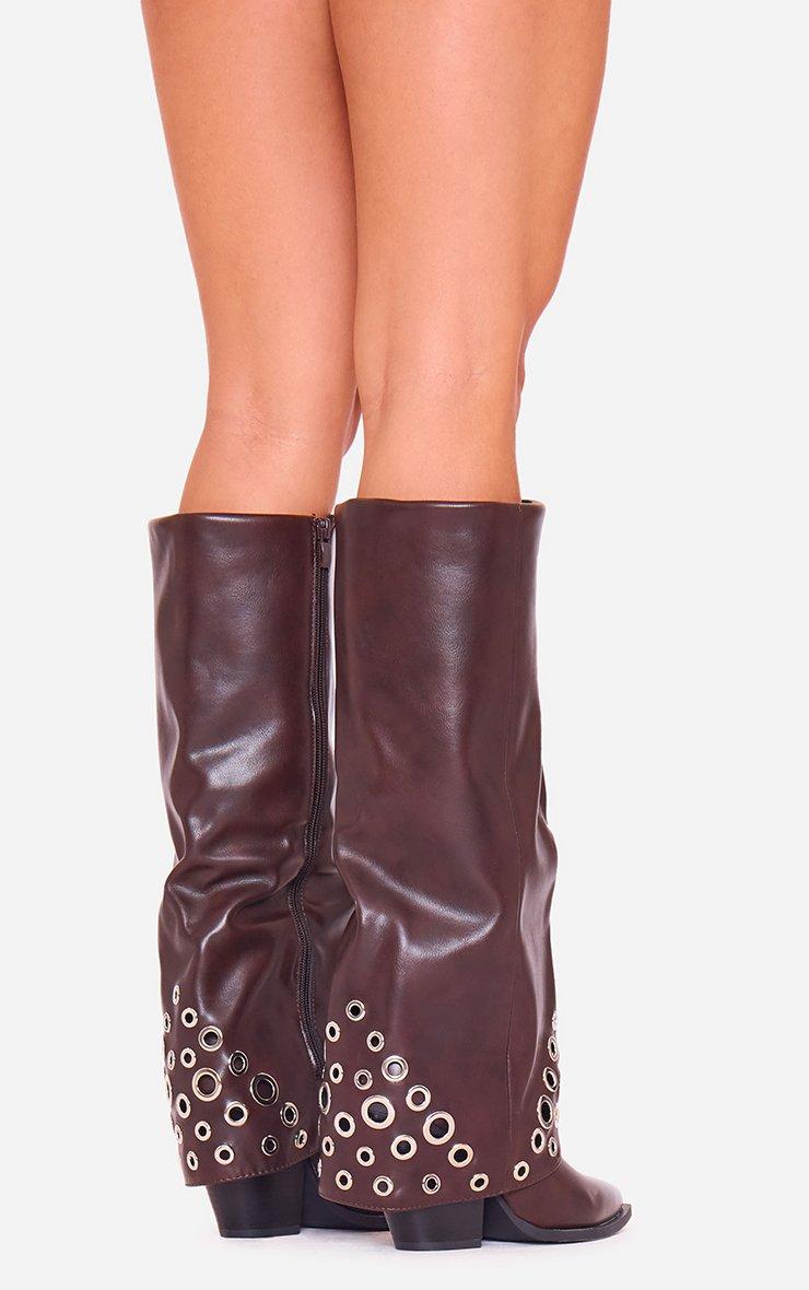 Step up your edge, doll! Featuring brown faux leather with eyelet layered detail and pointed toe knee-high silhouette, these boots bring bold, chic vibes perfect for making a statement with attitude.