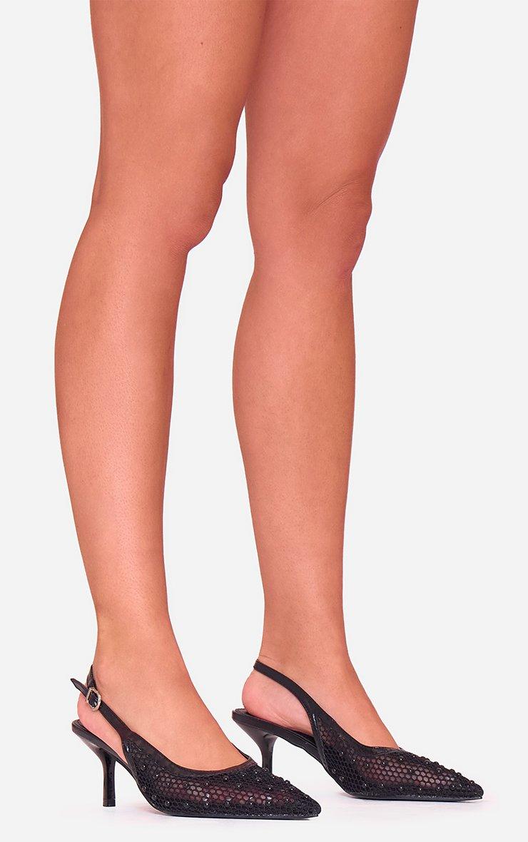 Iluka Diamante Detail Pointed Toe Slingback Court Heel In Black Faux Leather