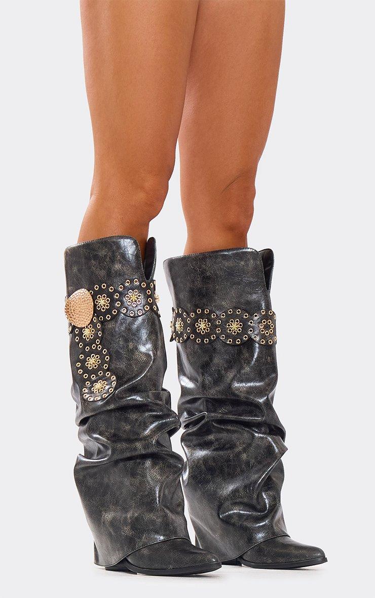 Thorn-Back Belt Detail Pointed Toe Knee High Slouched Boot In Distressed Black Faux Leather