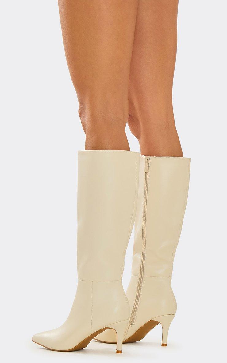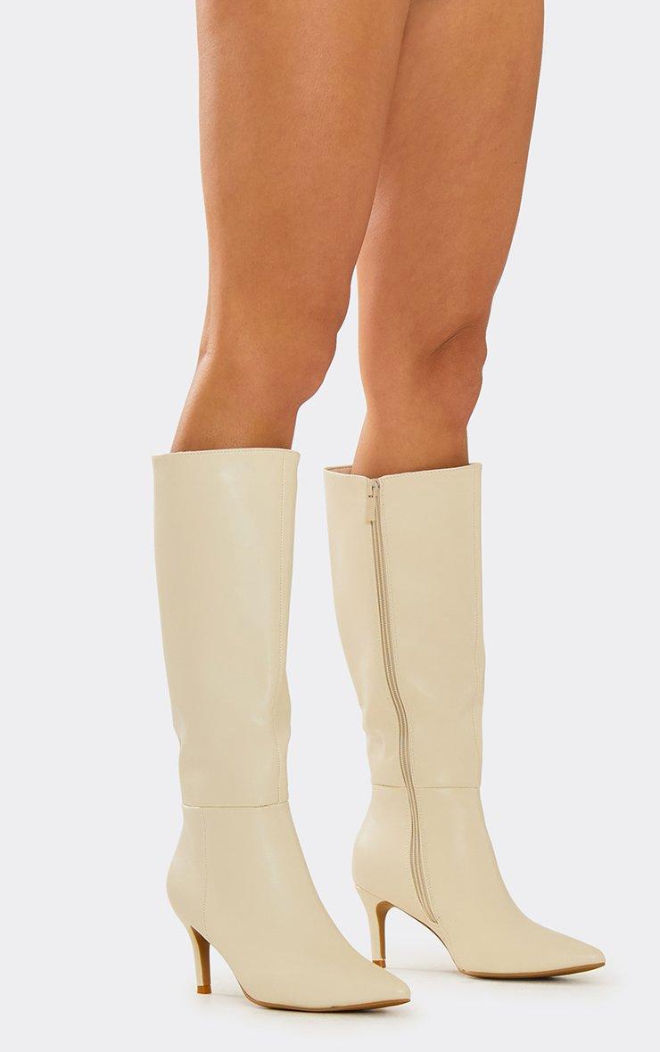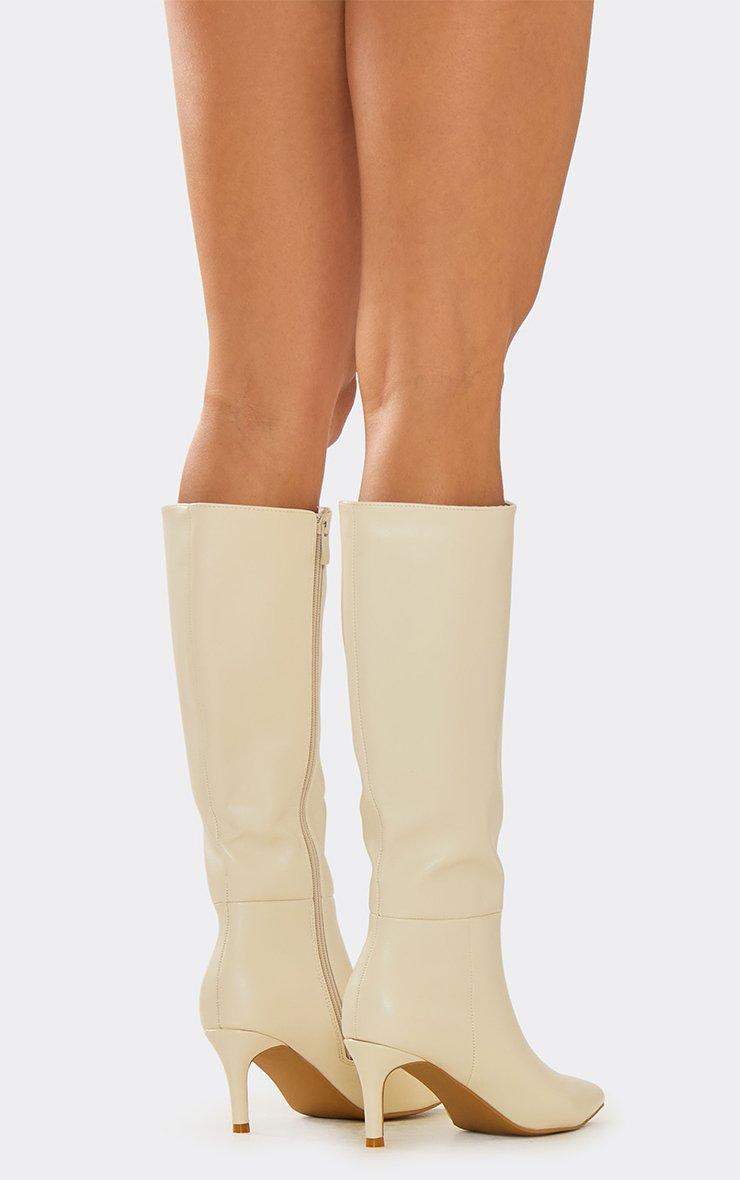 Tarsier Pointed Toe Knee High Long Heeled Boot In Beige Faux Leather