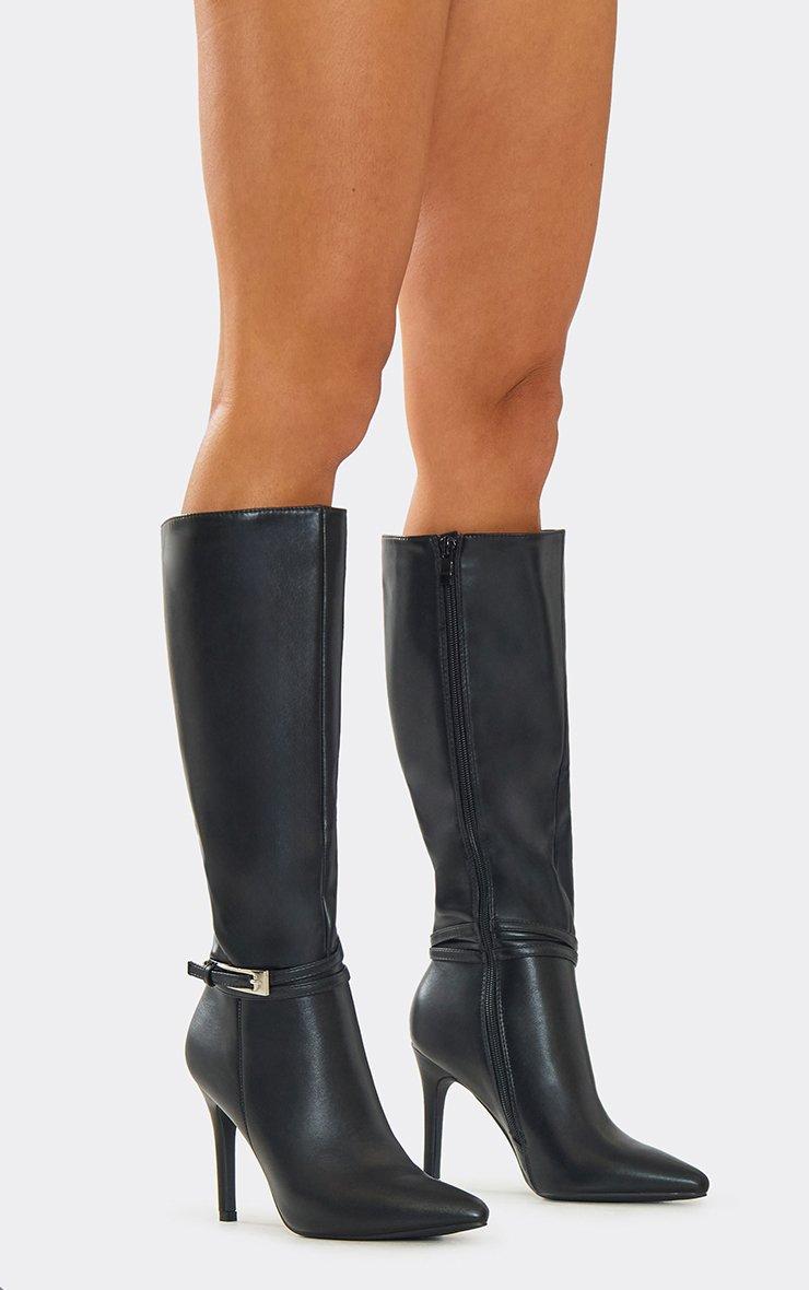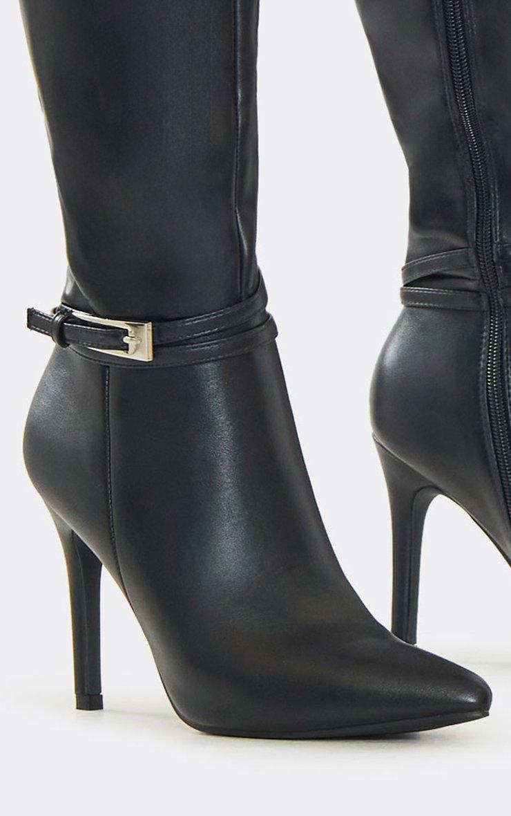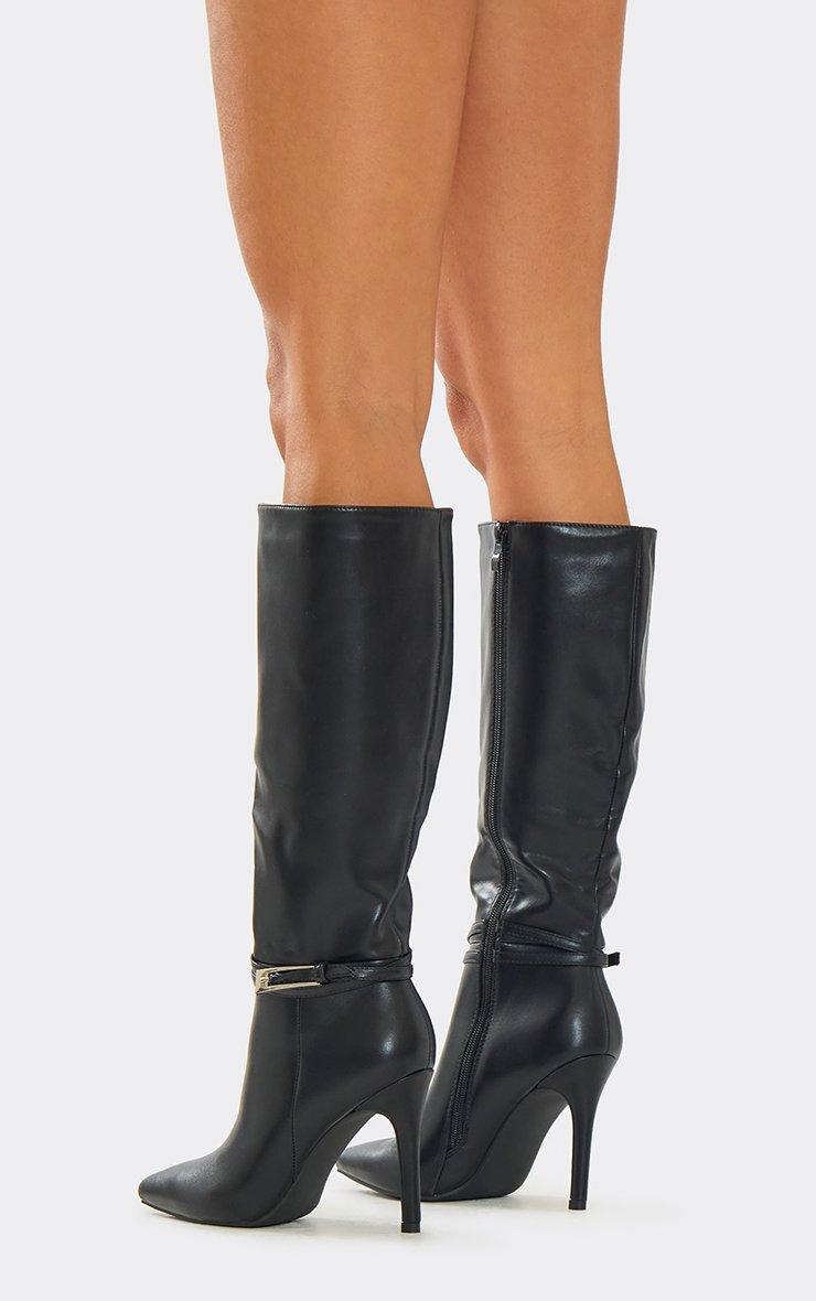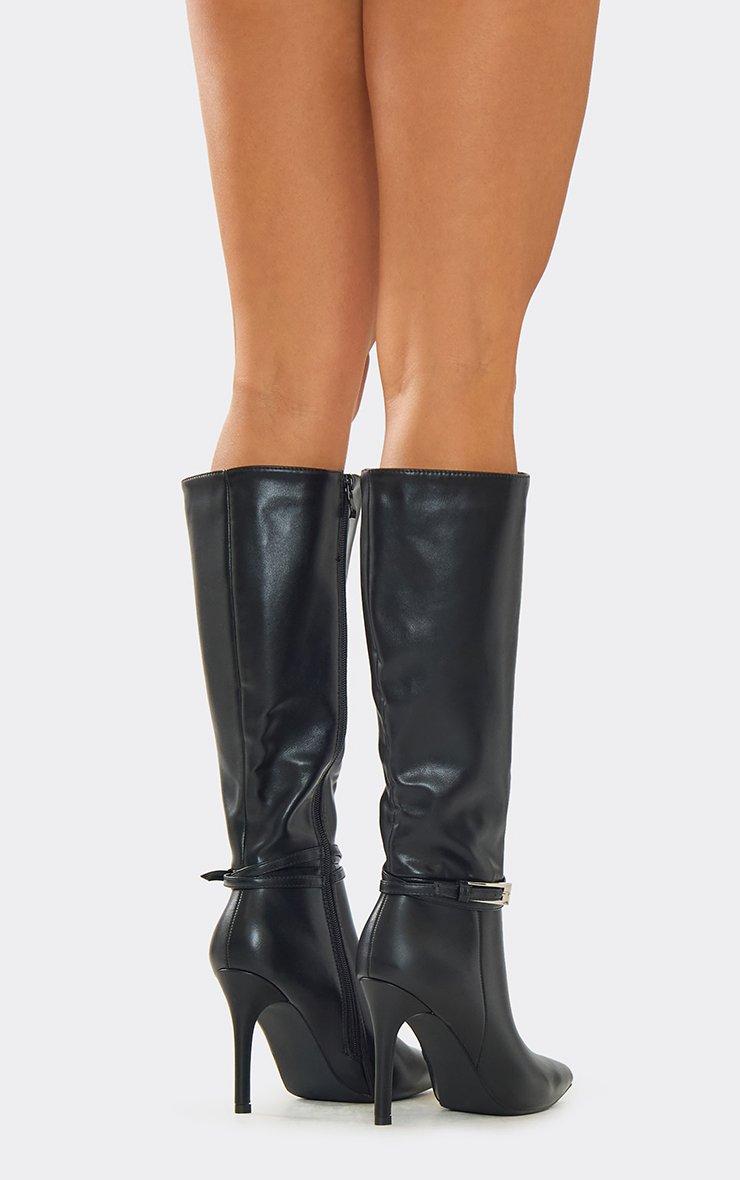 Pangolin Buckle Strap Detail Pointed Toe Stiletto Heel Knee High Long Boot In Black Faux Leather