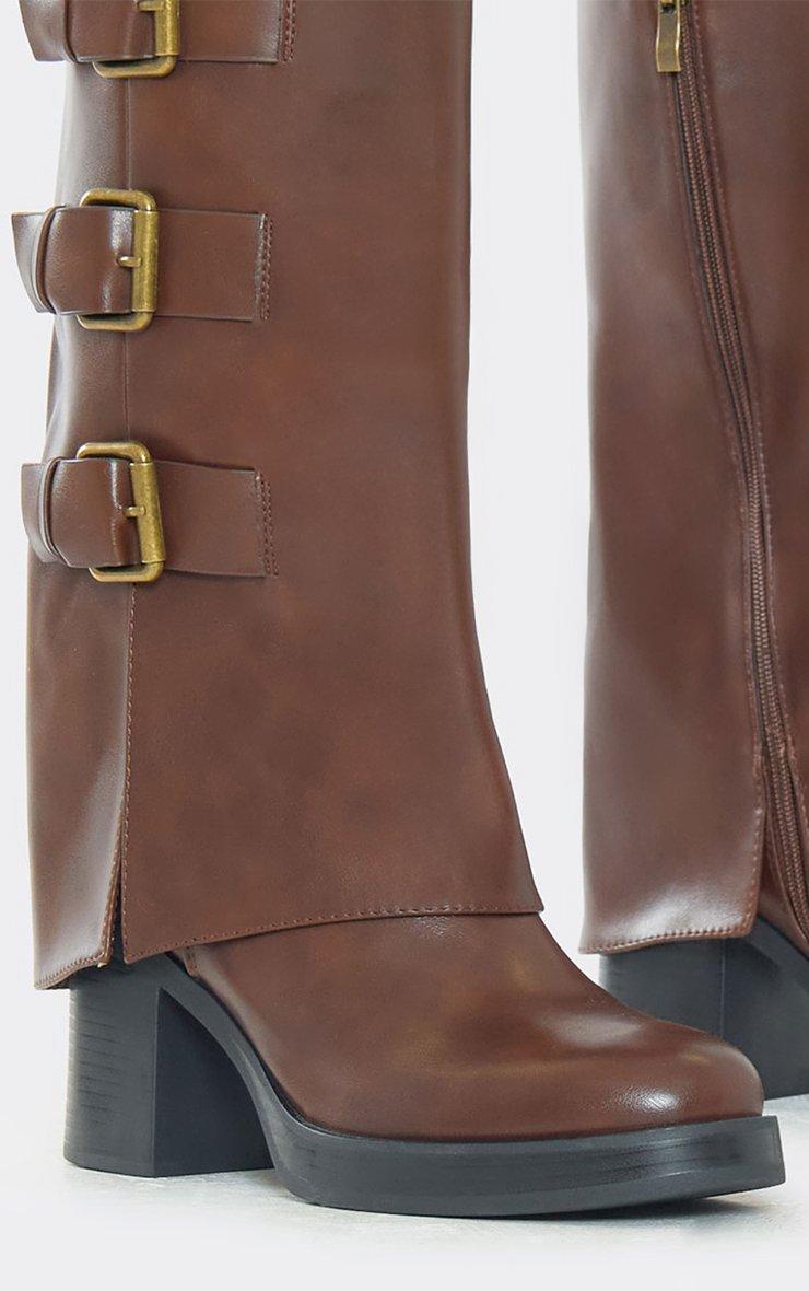 System Buckle Layered Detail Mid Calf Block Heel Boot In Brown Faux Leather