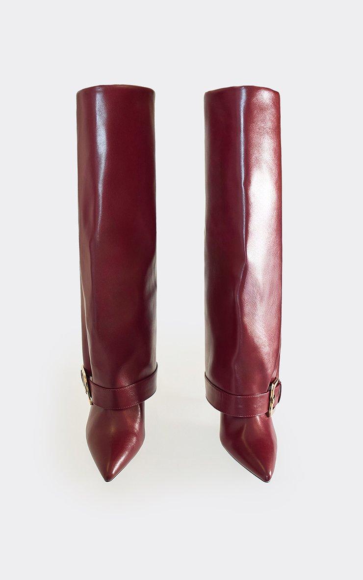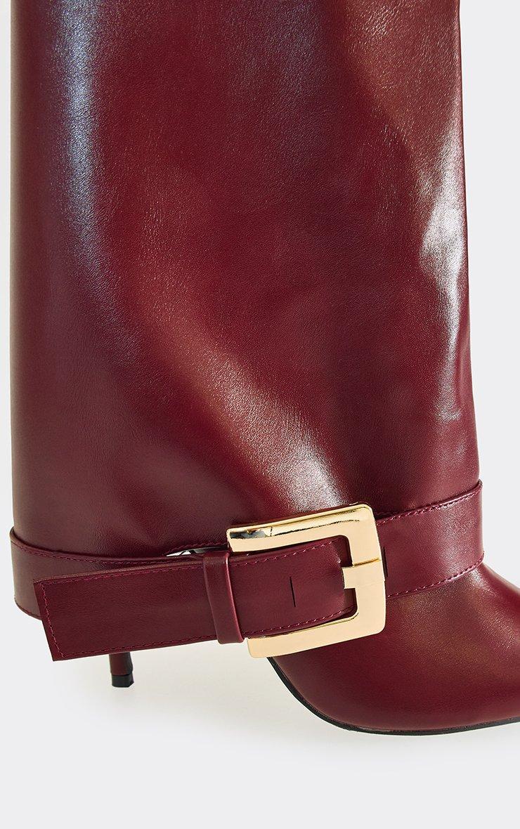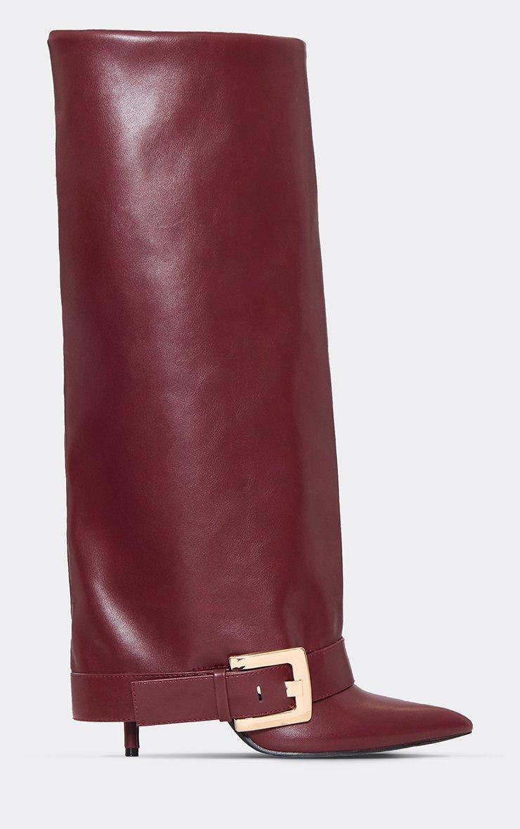Lucky Buckle Layered Detail Pointed Toe Stiletto Heel Knee High Boot In Burgundy Faux Leather