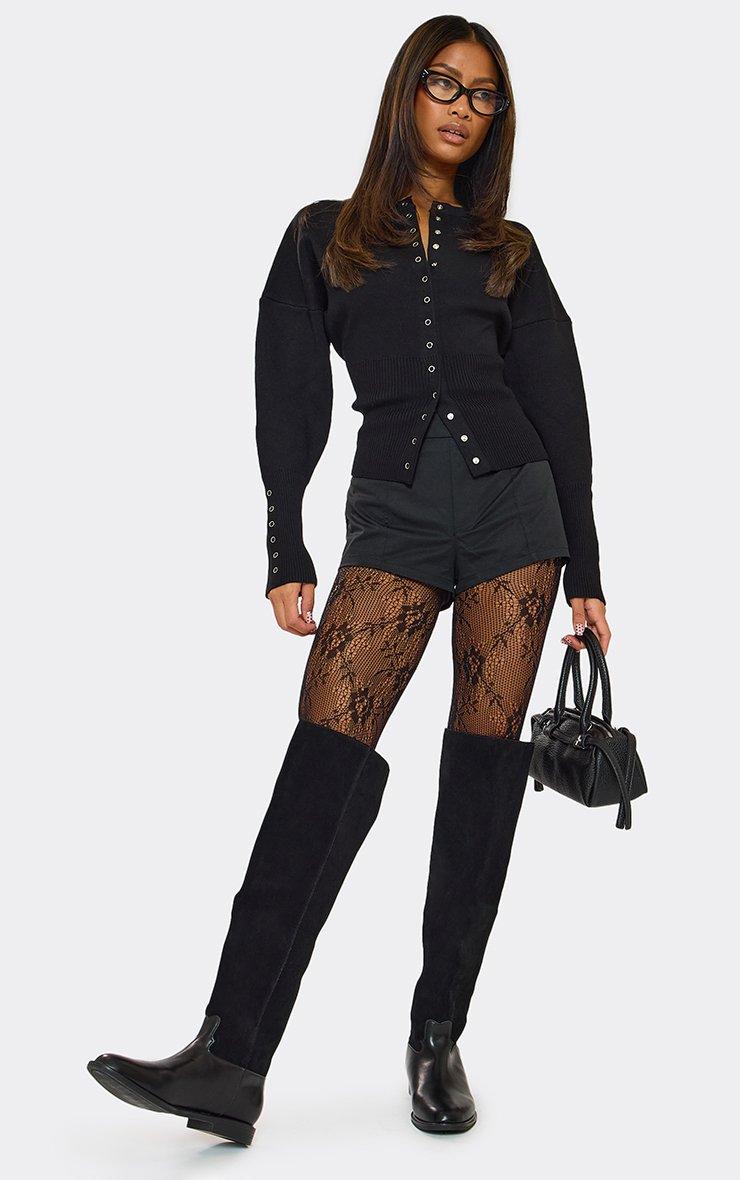 Step into edgy vibes, doll. Featuring black faux leather material with contrast and knee-high detailing in a long flat boot design, these boots bring chic it-girl energy. Style with a mini dress or skinny jeans for boss-babe looks.