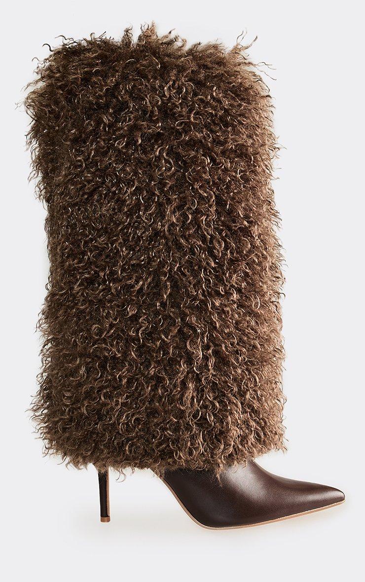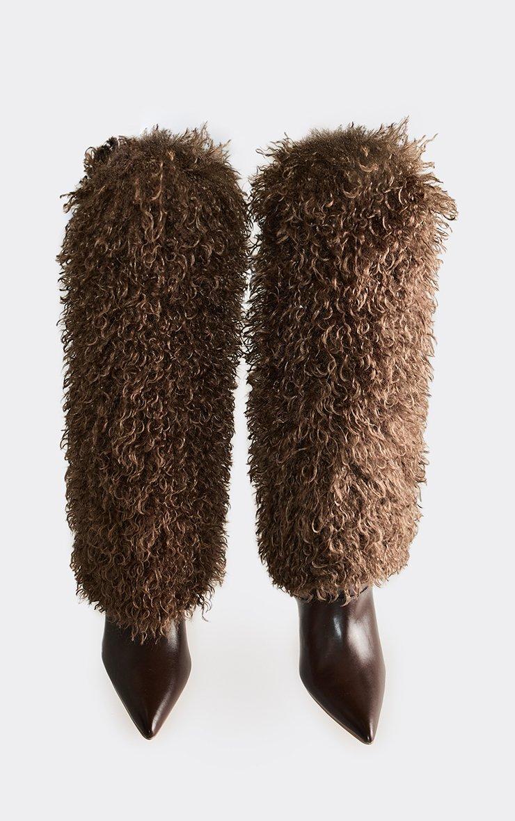 Serve fierce winter vibes, doll. Featuring brown faux fur material with graduated layered and pointed toe stiletto heel detailing, these boots bring bold it-girl energy. Style with a mini dress or chunky knit for a standout cold-weather look.
