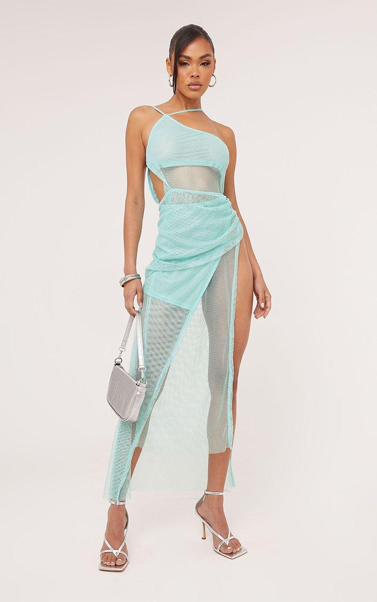 This dress is a yes form us. Featuring a blue metallic net material, a one shoulder, an open back, a side split and a maxi length.