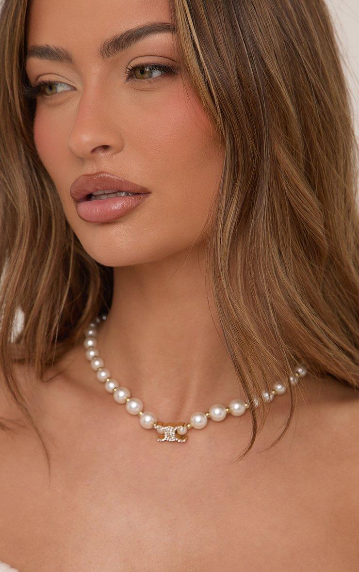 Logo Detail Pearl Necklace In Cream And Gold
