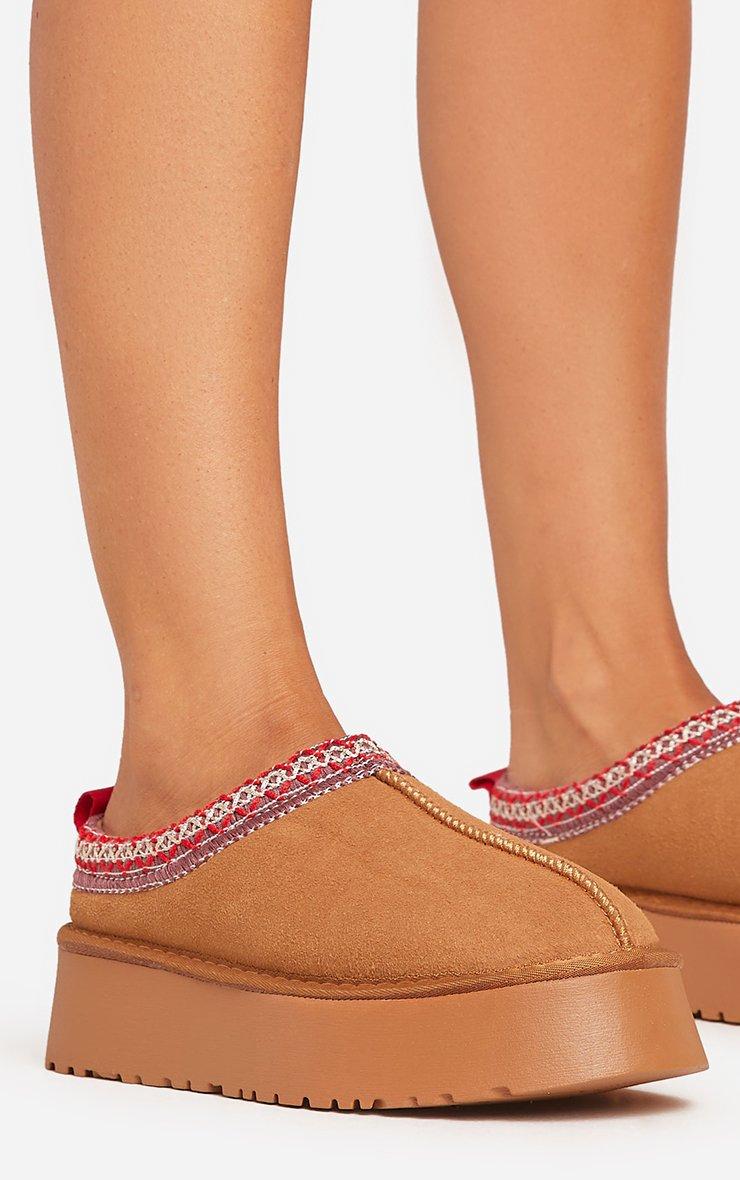 Tazmin Aztec Detail Faux Fur Lining Platform Slipper In Chestnut Faux Suede