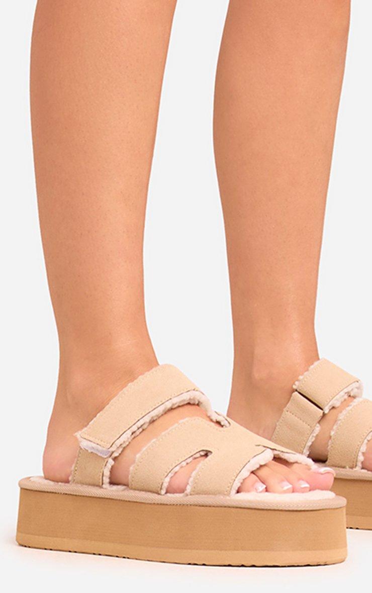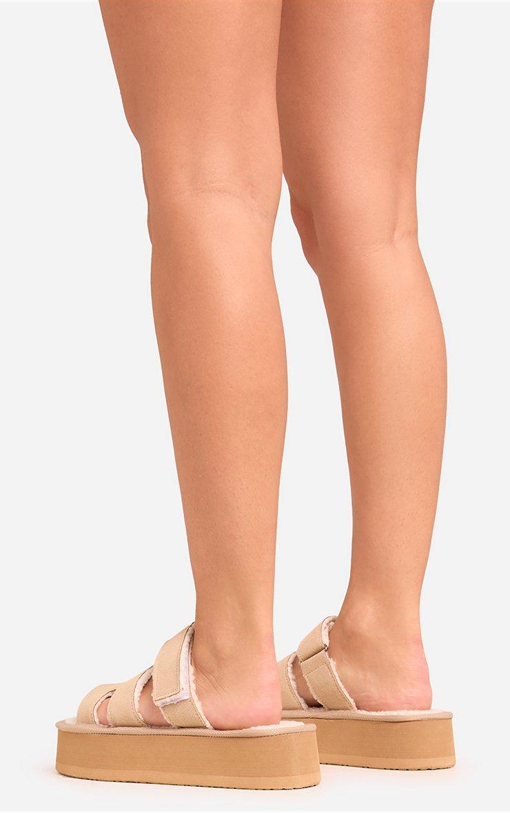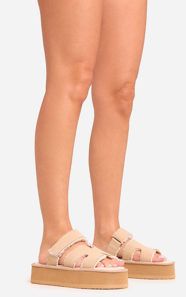 Zoomies Cut Out Strap Detail Faux Shearling Insole Platform Slider In Beige Faux Suede
