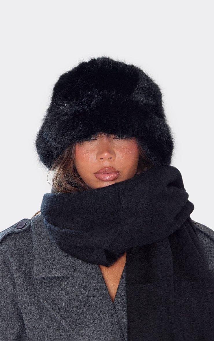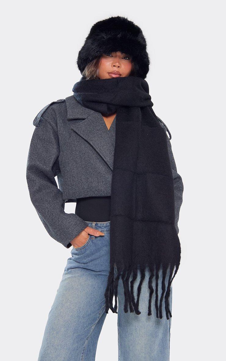 Serve sleek-chic vibes, doll, featuring a black material with oversized and fringe detailing, this scarf brings bold, stylish energy with attitude.