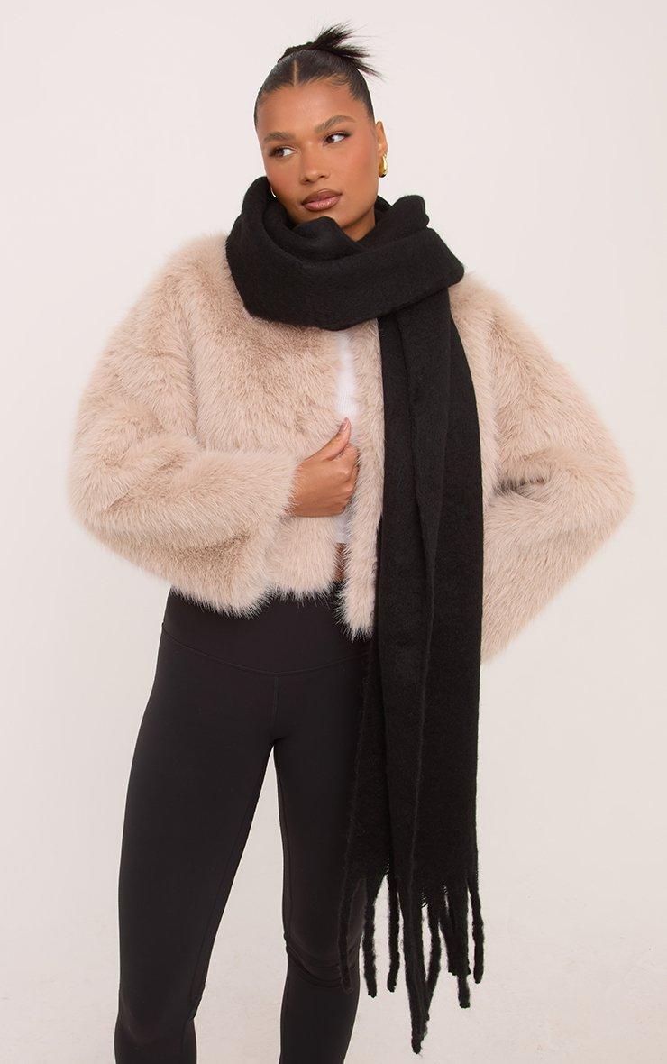 Time to make a statement, babe! This oversized scarf in black features trendy fringe hem detailing, adding the perfect touch of drama to any outfit.
