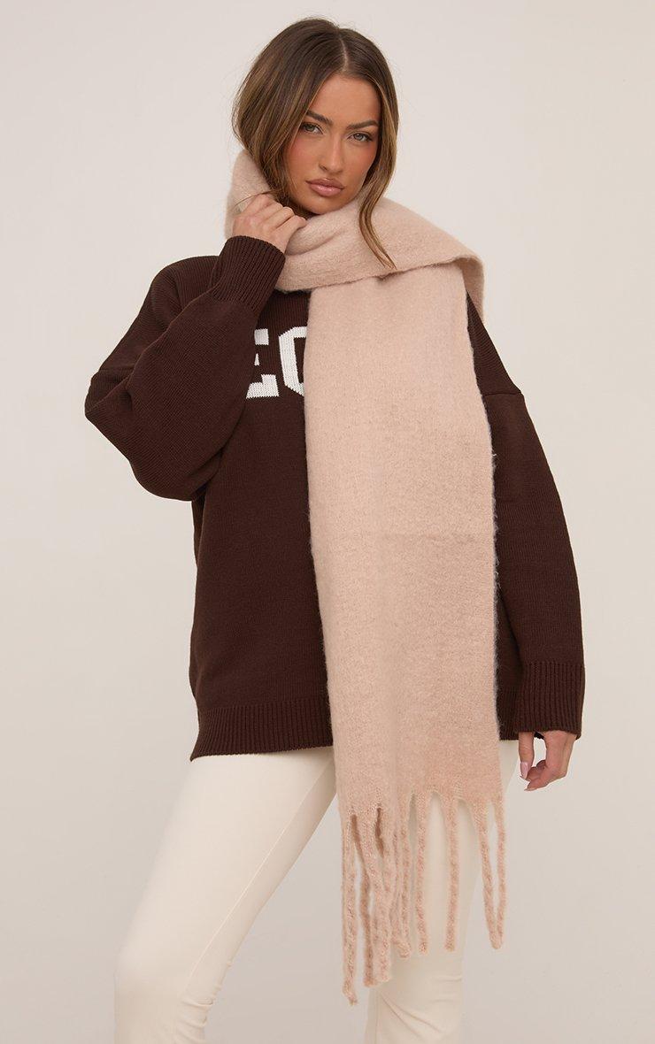 Got a cozy night out planned, doll? Featuring soft fabric with stylish fringe hem detailing in a chic nude shade, this scarf adds a touch of elegance and warmth.