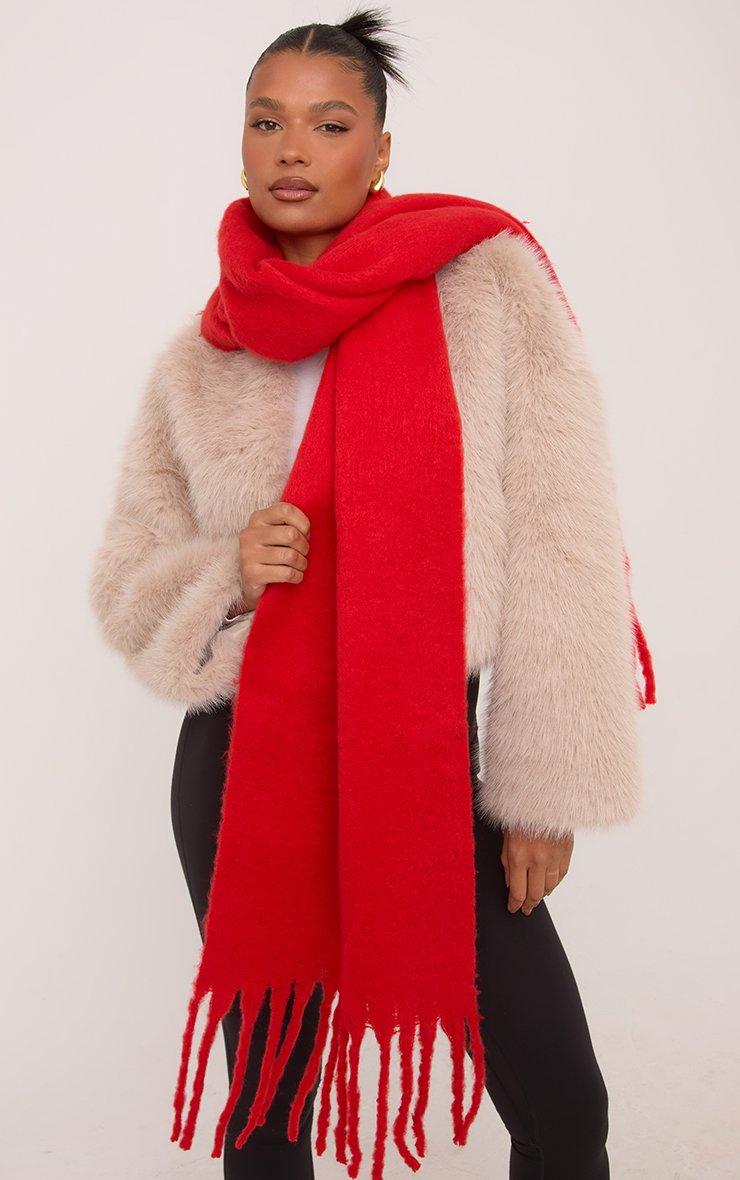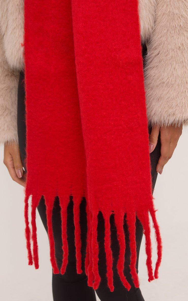Time to make a statement, babe! This oversized scarf in red features trendy fringe hem detailing, adding the perfect touch of drama to any outfit.