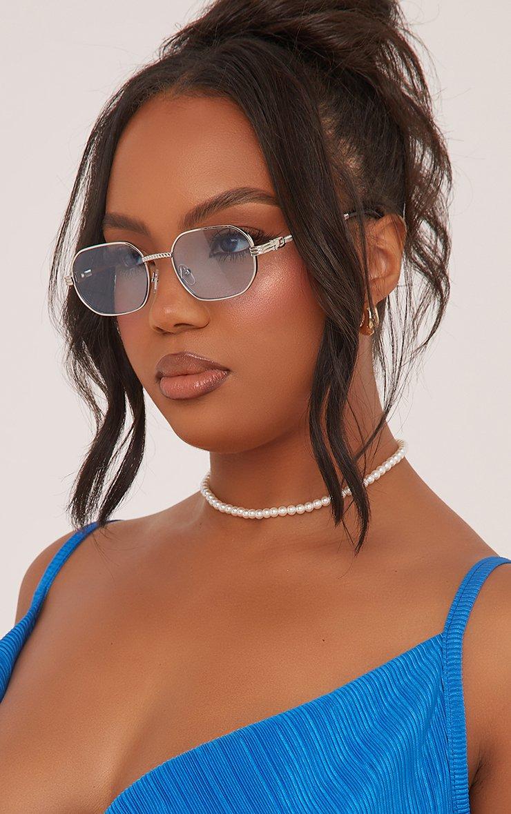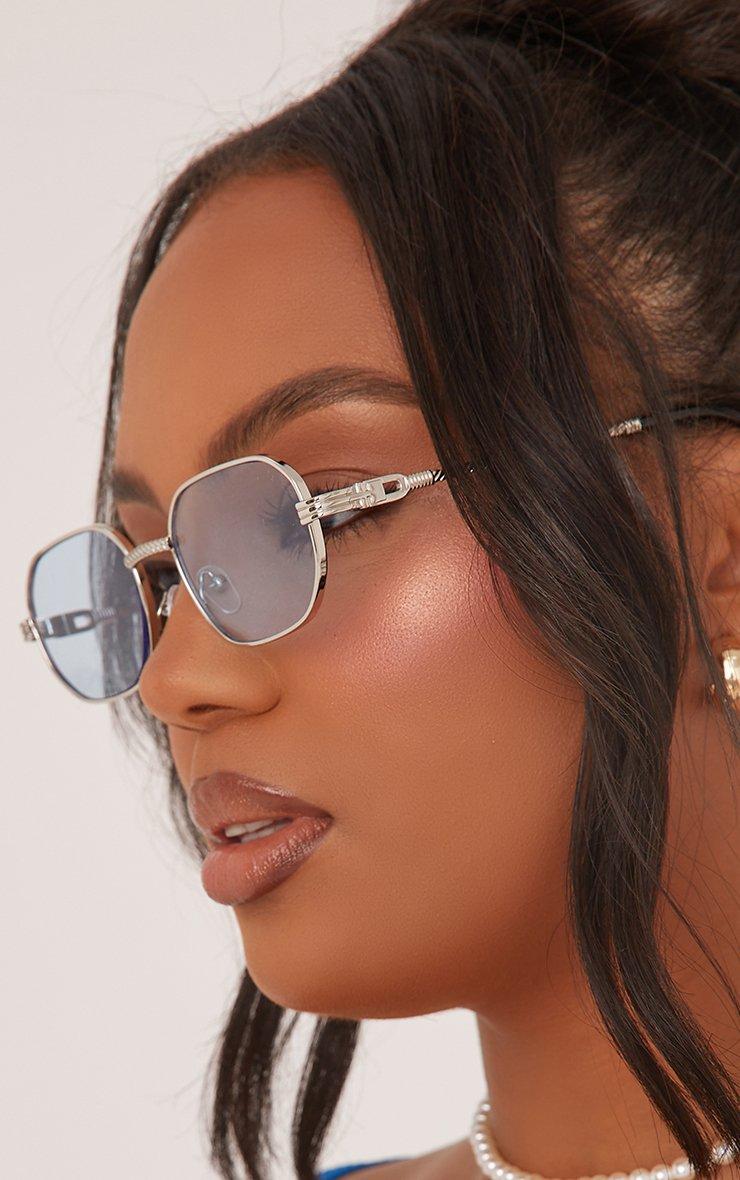 Cool girl vibes all round with these sunglasses. Featuring a silver metal material, blue tinted lenses, a thin frame and a round shape.