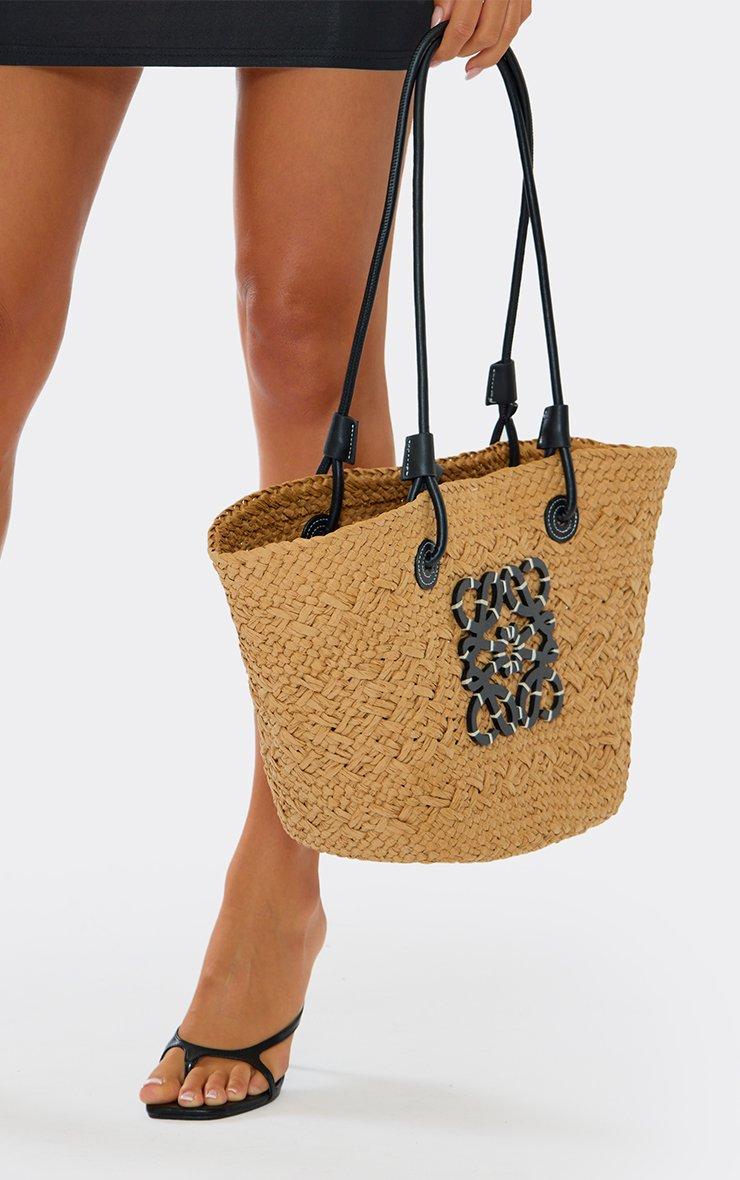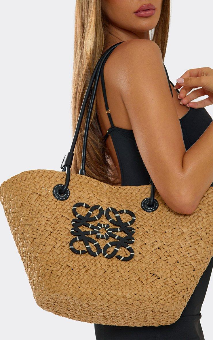 Beach-ready vibes, doll. Featuring brown and black woven material with swirl detailing, this bag is giving bold, chic energy for statement seaside or festival looks.