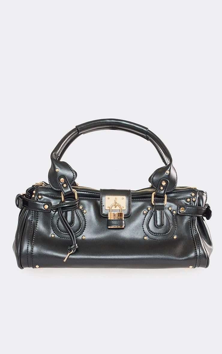 Serve edgy, statement vibes, doll. Featuring black faux leather material with studded lock detail and shaped grab bag styling, this piece brings bold it-girl energy. Style with mini dresses or tailored outfits for a standout finish.