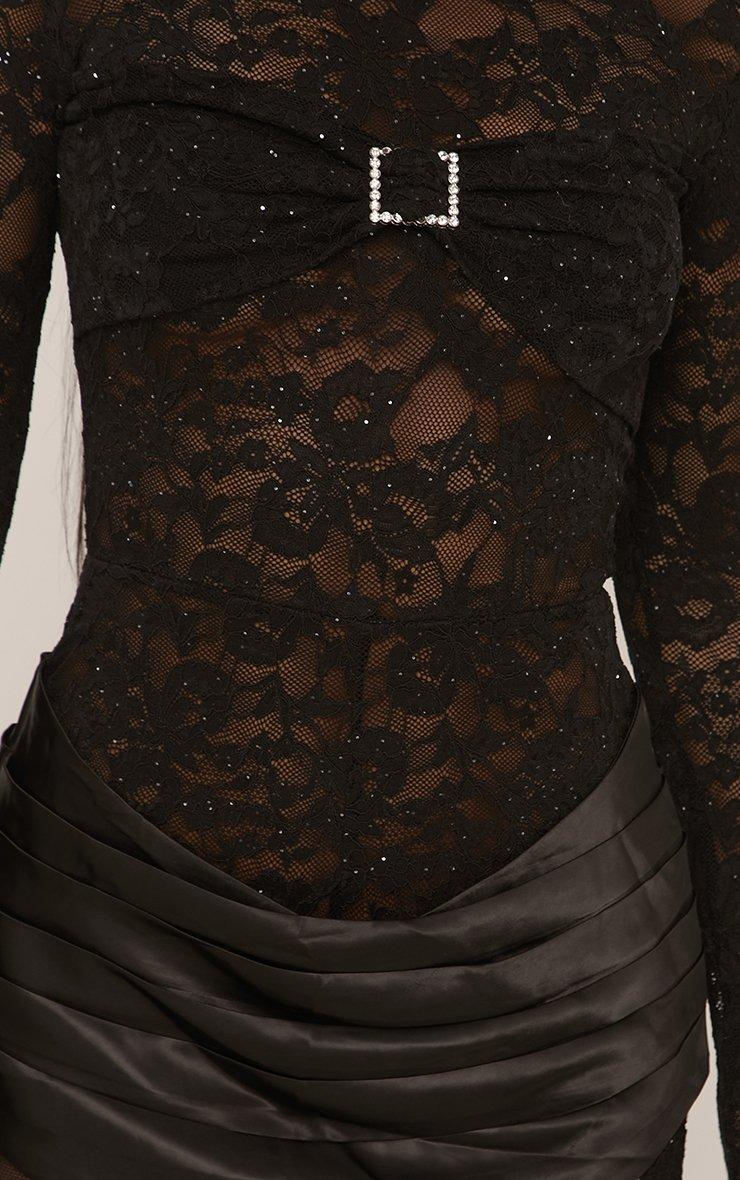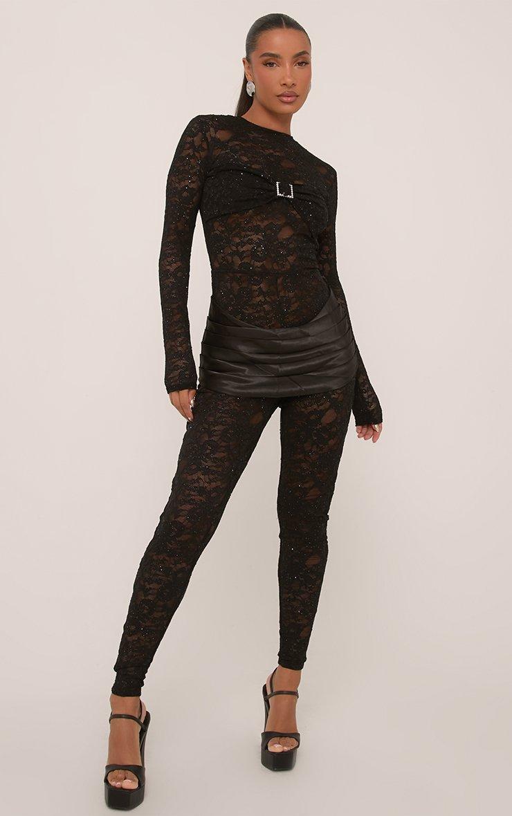 Make an unforgettable statement in our Long Sleeve Diamante Buckle Bust Satin Draped Front Jumpsuit In Black Sequin Lace. This black lace sequin jumpsuit is pure drama with its long sleeves, diamante buckle detail and satin draped front design. Slip into this long sleeve jumpsuit for an instant confidence boost!