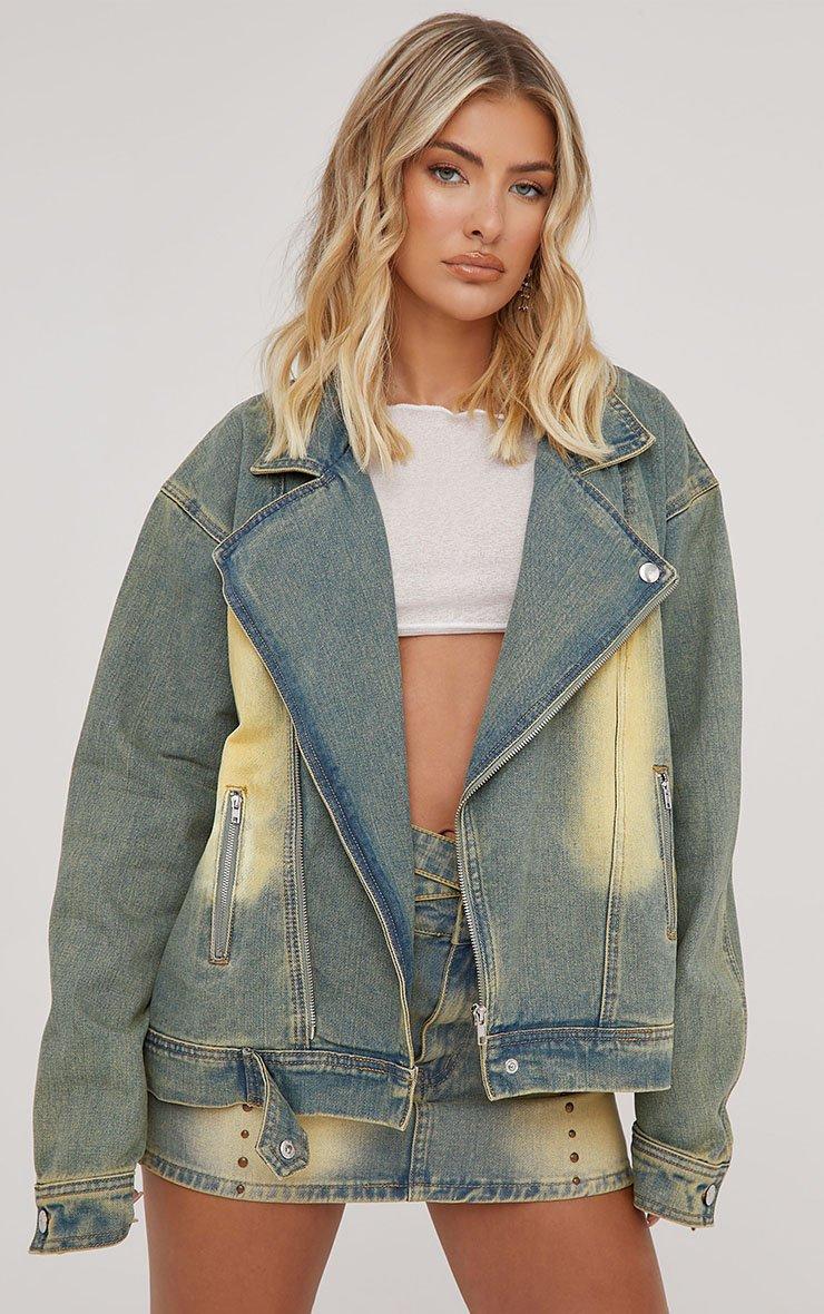 Oversized Biker Jacket In Blue Vintage Washed Denim