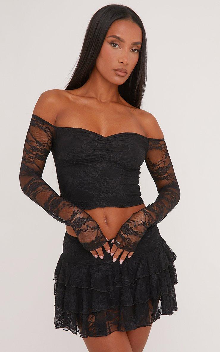 Turn up the heat with this Bardot Crop Top In Black Lace. This black lace crop top is pure perfection with its sultry Bardot neckline that shows off sun-kissed shoulders and intricate black lace that adds a hint of edgy elegance. Perfect for a night out or spicing up a casual look, it pairs effortlessly with the matching lace mini skirt. Embrace your inner diva with this stand-out holiday co-ord!