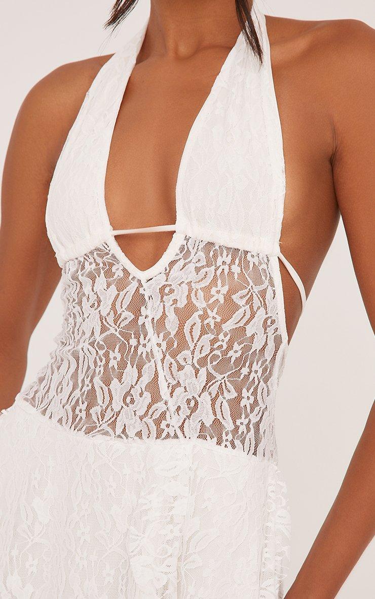 This dress is a yes from us doll. Featuring a white lace material, a plunge front, frill detailing and a mini length.
