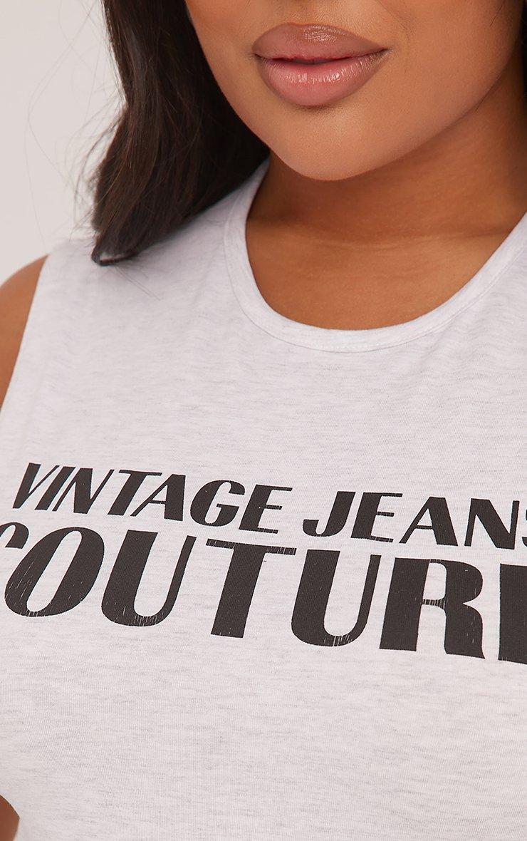 We love this top for those casual days. Featuring a grey material, a sleeveless style and a vintage jeans couture slogan print.