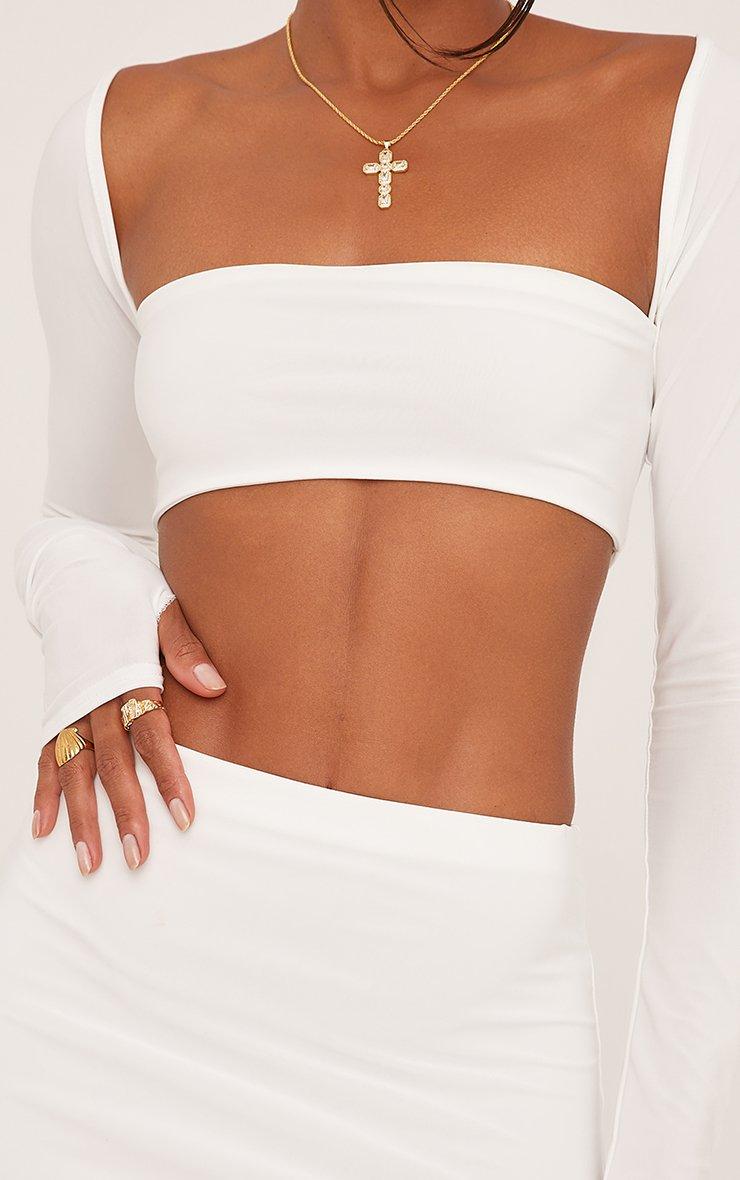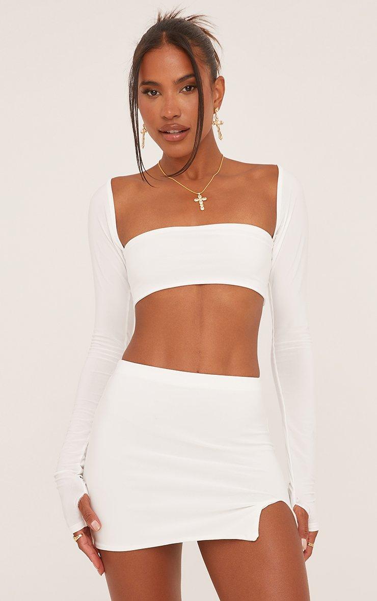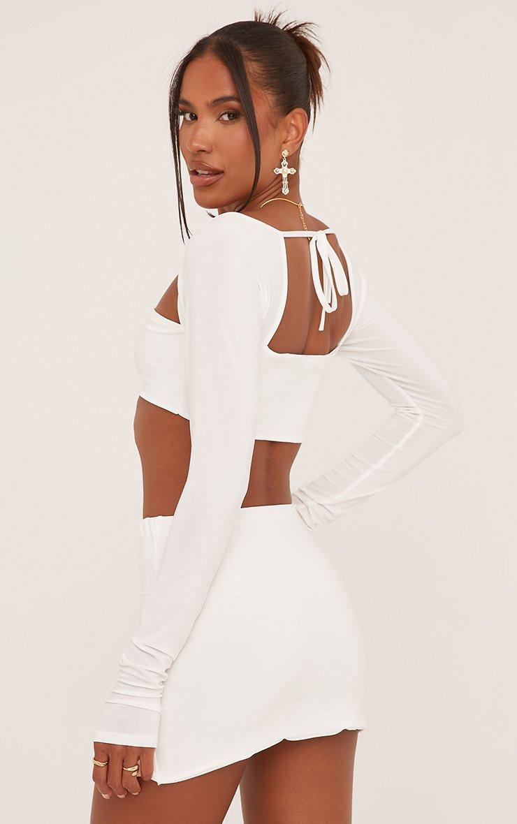 Long Sleeve Square Neck Crop Top And High Waist Mini Skirt Co-Ord Set In White Slinky