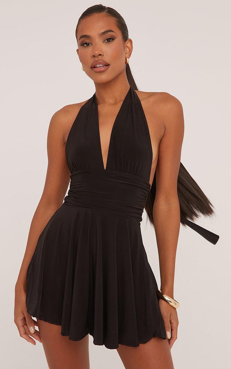 This LBD will be a wardrobe staple doll. Featuring a black slinky material, a plunge halterneck, an open back, flippy hem and a skater style.