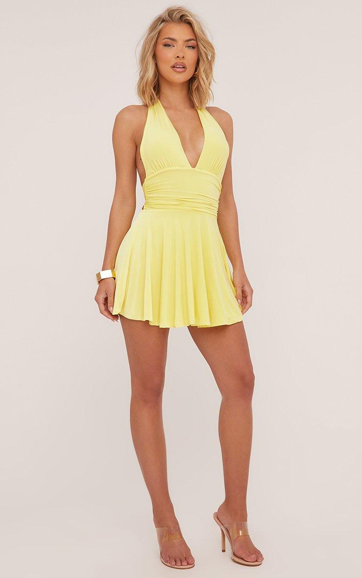 Plunge Halterneck Open Back Flippy Hem Mini Skater Dress In Pastel Yellow Slinky