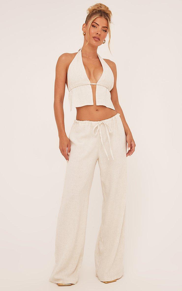 Halterneck Split Hem Tie Back Top In Stone Linen